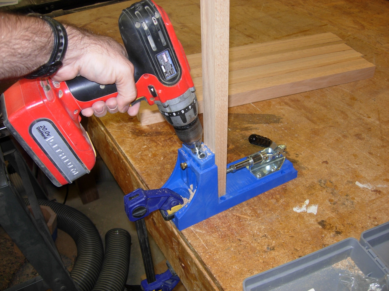 I set aside all of the 23″ long side pieces for later, then take the front and rear pieces over to my Kreg pocket hole jig. I drilled two pocket holes into each end of them.