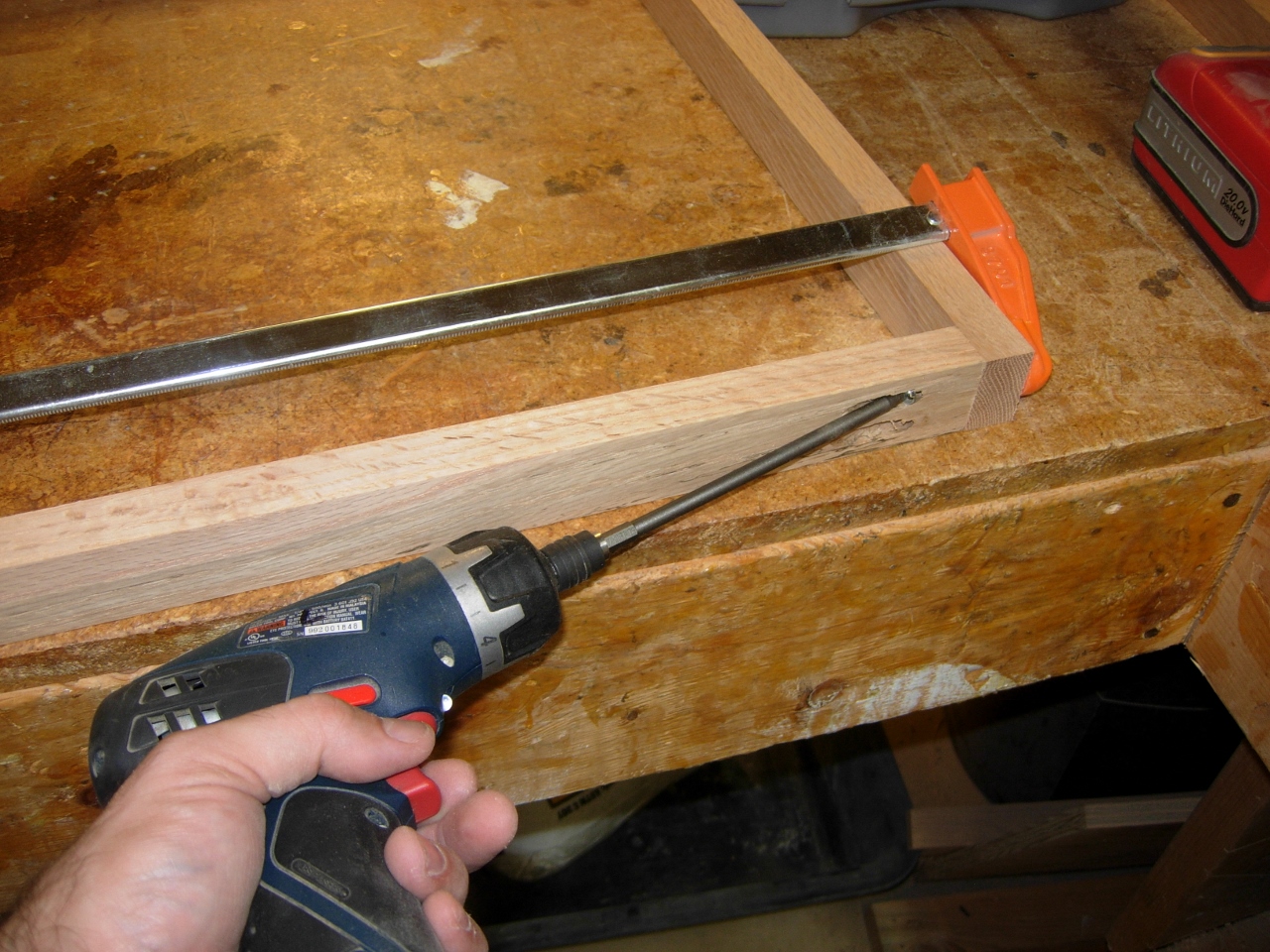 I clamp the frame together tightly, making sure that all of the edges are flush, then install a fine threaded 1-1/4″ pocket hole screw into each hole.