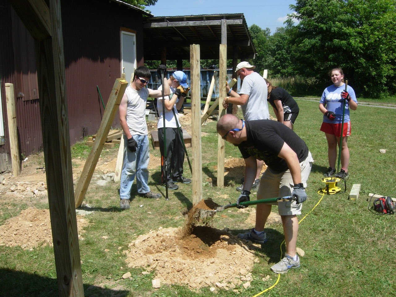 We set about of 8″ of dry quickcrete in the bottom of the holes for footers, then set the posts. We needed to get the holes filled before the other crews came back for the day. Not bad progress for a hot day in the sun. I will try to post more this week if I can.