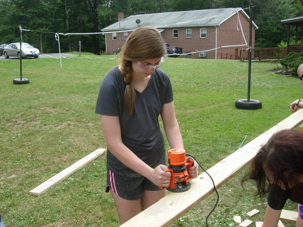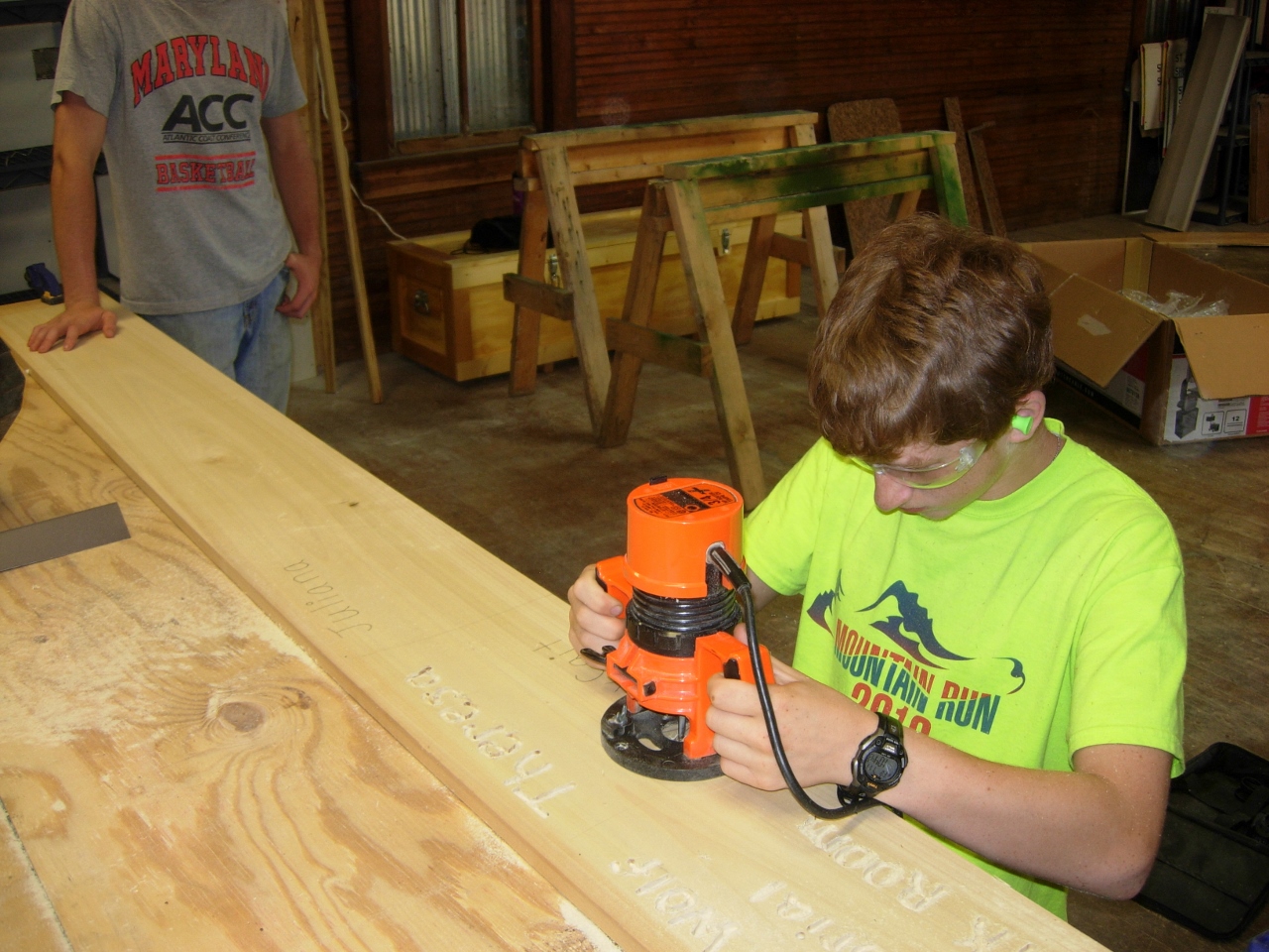 Since we finished half a day early, I taught the boys how to make signs, freehand with the router. They had a blast, and we made signs for the girls and the other adults in my crew.