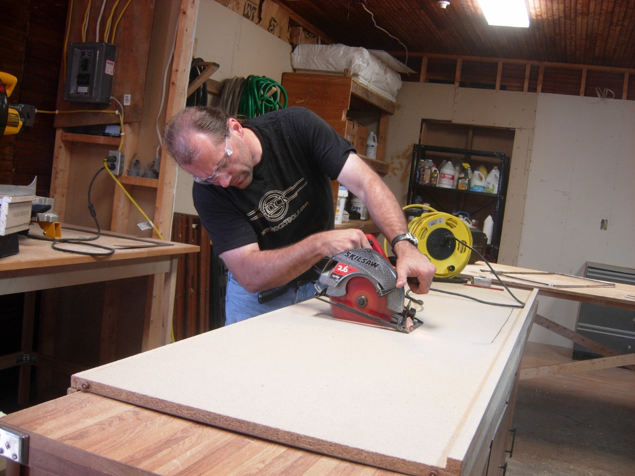 I cut the counter down with the circular saw, from the rear. Then I cut the straight parts of the hole for the sink.