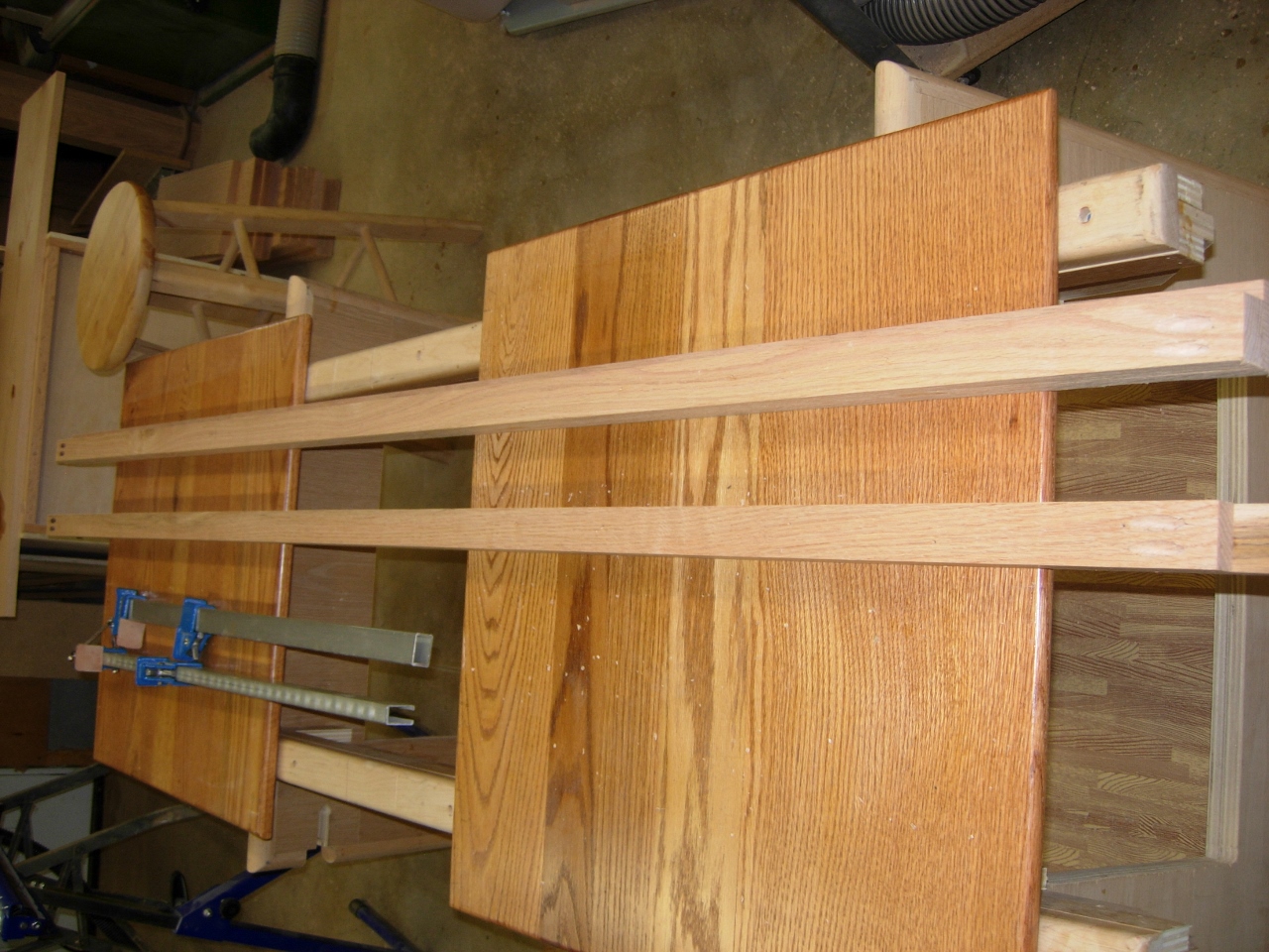 The last thing that I am working on today are the front and rear beams that will span the room and support the cabinets. I am making 1″ thick rails that will bolt to the wall, and attaching these beams to them. I am laminating together a 1″ thick piece to a 3/4″ thick piece for each. this will keep them straight and significantly add to their support strength. I will be making cross pieces as well, but that will be tomorrow’s fun.