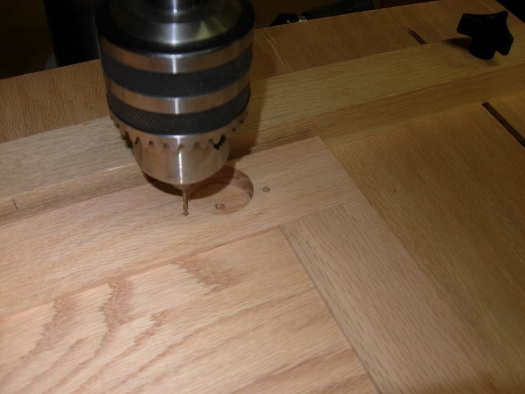 Instead of making a template, I used my mock-up as a locator for the mounting holes, for the hinges. I merely held it parallel to the edge of the door and scribed the holes with a pencil, then drilled all of the pilot holes on the drill press. These I could have drilled by hand, but I had this new drill press table…
