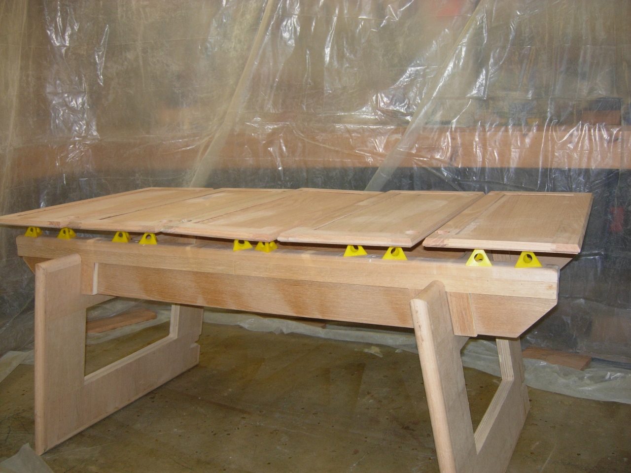 Next, I prepped the shelves for spraying by attaching a board to the side, so that each shelf would stand on its rear edge. I set a couple of rows of painter’s pyramids along my knock-down work bench, to support the small door panels.