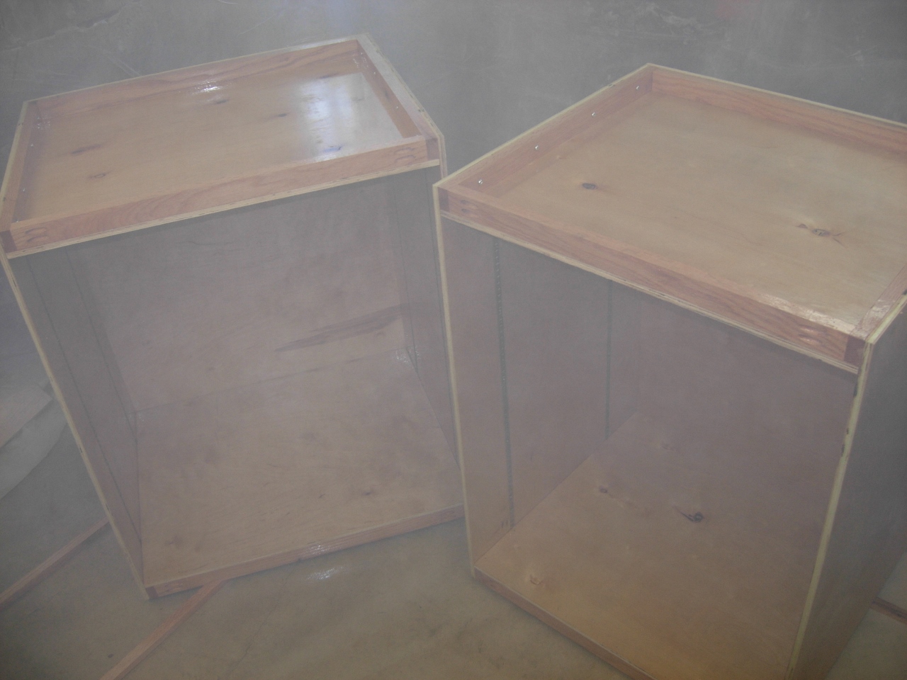 I crammed as may components, as I could, into the spray booth and fired up my Earlex HVLP sprayer. I loaded it with a pint of semi-gloss polyurethane, and started on the cabinet boxes. I sprayed the bottom and the back first, then I tipped them up onto a couple sticks, and sprayed the other surfaces of the boxes.