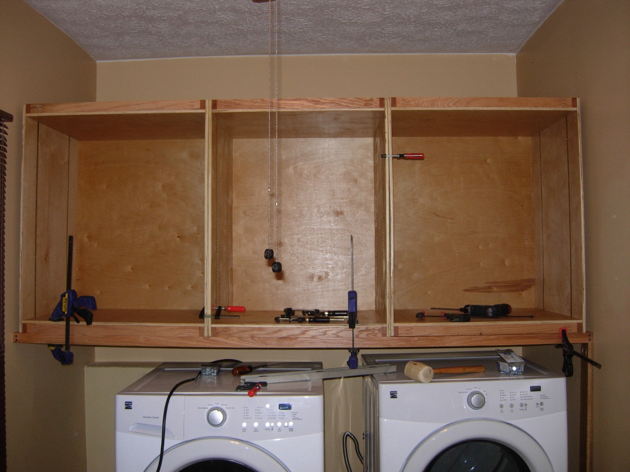 I started by setting the support frame-work in place and screwing it to the wall on either side. I added a support to the front-right side because there was no stud over there. Next, I set the cabinet boxes in place and clamped them all tightly together. Once all was clamped up, I screwed the upper and lower box frames together, then screwed the support frame to the bottom of the boxes.