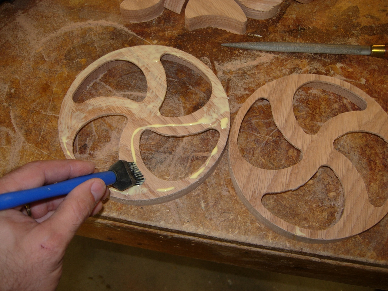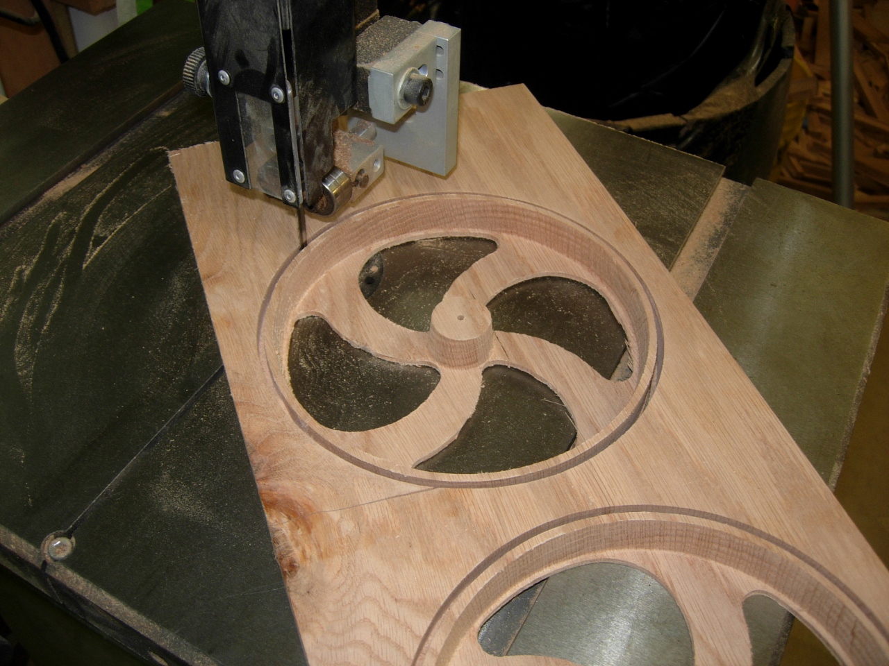 I didn’t put tabs on the outside edge, just cut most of the way through. It was easy to make the final cut-outs on the bandsaw and clean up the remaining wood on the scroll saw.
