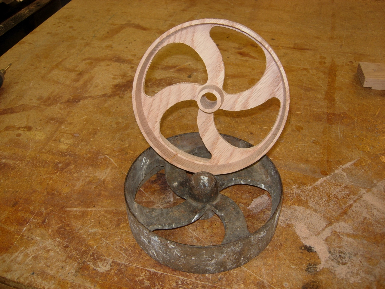 While the wooden wheel is the same dimensions as the steel one, it is significantly more brittle. Future versions will probably have to be thicker for strength, but this test piece definitely shows that the wheel can be replicated.