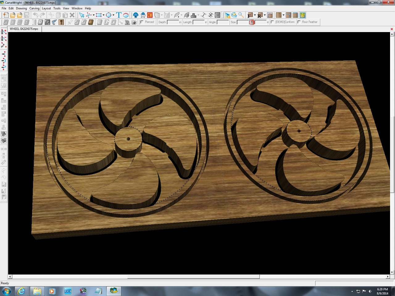 I spent an hour or two playing with the software. I actually draw the shapes up in AutoCAD then import them into the Carvewright software. This allows me to assign cutting tools to the individual lines. I made two versions, one is double-sided and will need a 1-3/4″ thick blank. Since I didn’t have one at hand, I ran the second version. Basically I split the wheel in half and mirrored it. When the carver is done, I will just glue the two halves together.