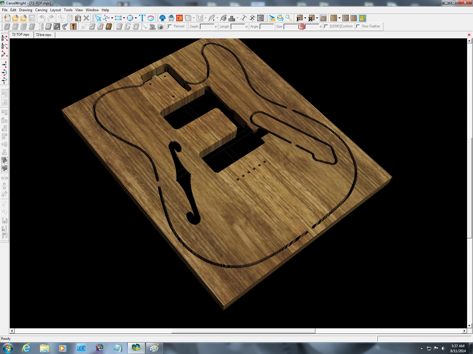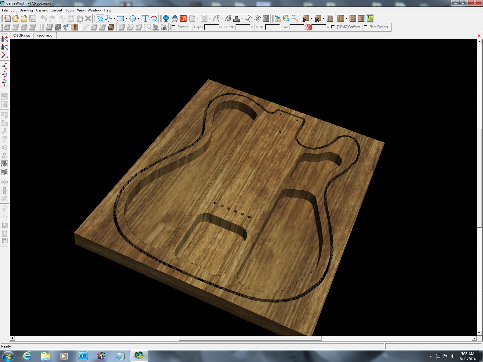 I had a request for another guitar body. This one is a little different from the solid body guitars that I have built before. This guitar body is modeled after a Fender 72 thinline telecaster. Since it is a hollow body, I decided to try creating a program for it on my Carvewright CNC router. I downloaded a few online images of the body’s chamber locations and some overall dimensions. I modeled the entire thing in AutoCAD, then imported the lines into the Carvewright’s software. These are what I came up with.