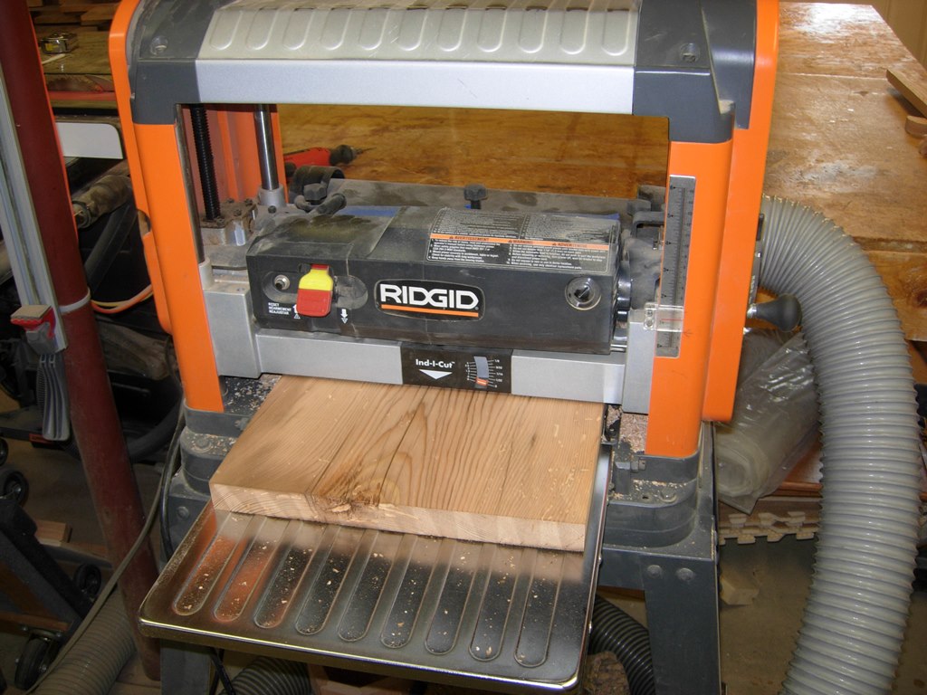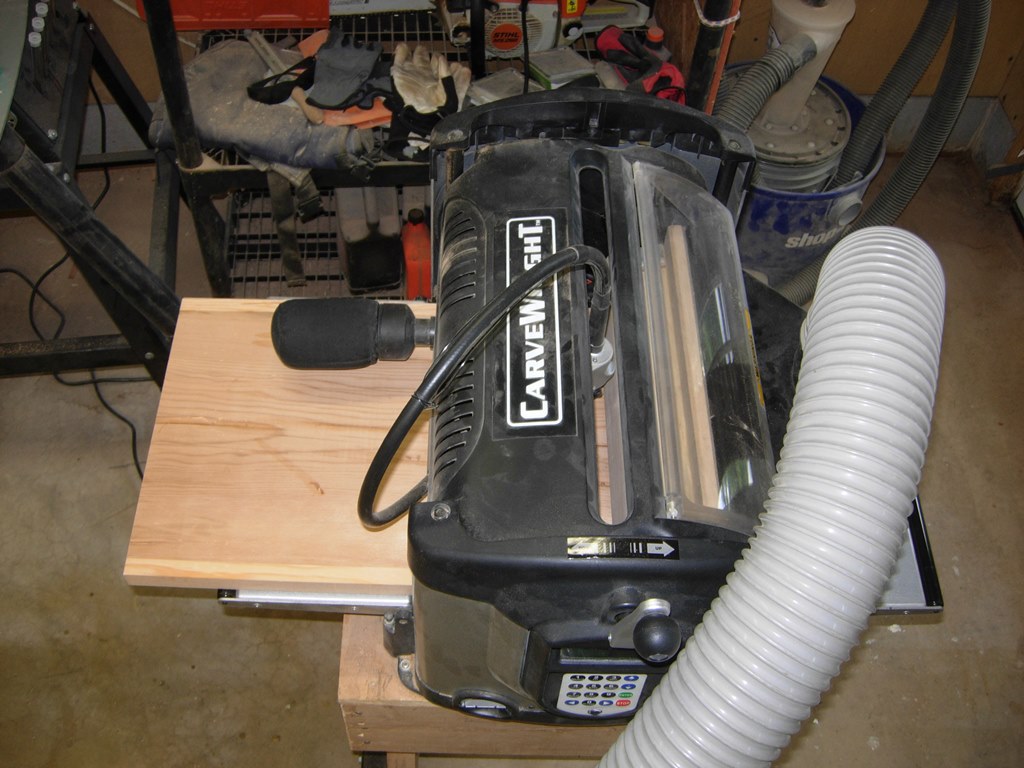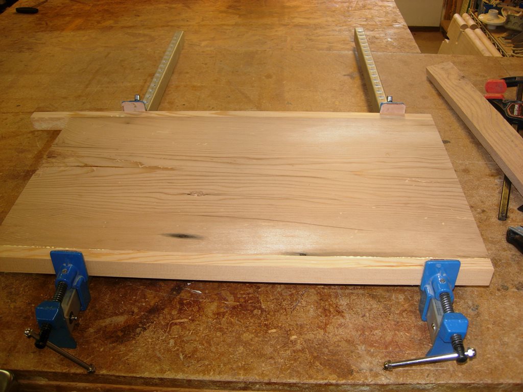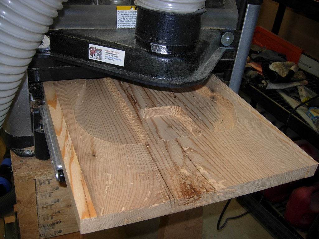 The guitar body is a little over 12-3/4″ wide and my planer will handle a maximum of 13″. I decided to cut it to fit the planer and take it down to the required thickness, then add side rails to meet the requirements of the CNC. The CNC requires 1/2″ of extra wood on each side of the carve, for the rollers to roll on. Since I can carve up to a 14-1/2″ wide piece on the CNC, I decided to cut two 3/4″ pieces of fir for this purpose.