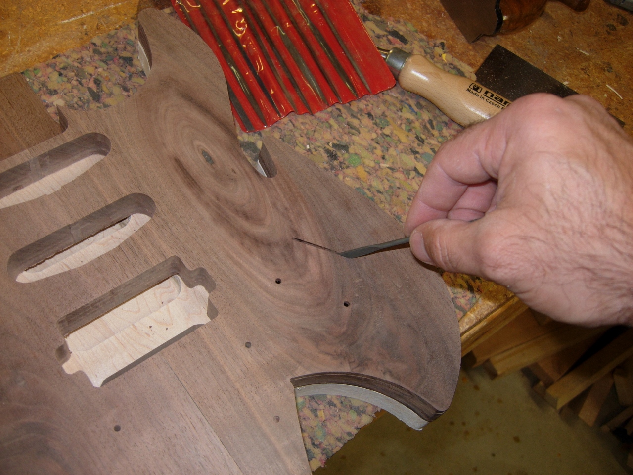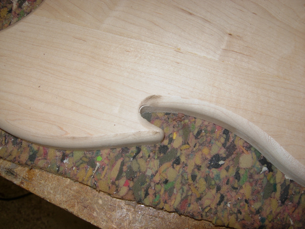I held the guitar on edge and drilled a 3/4″ hole through the side into the control cavity.