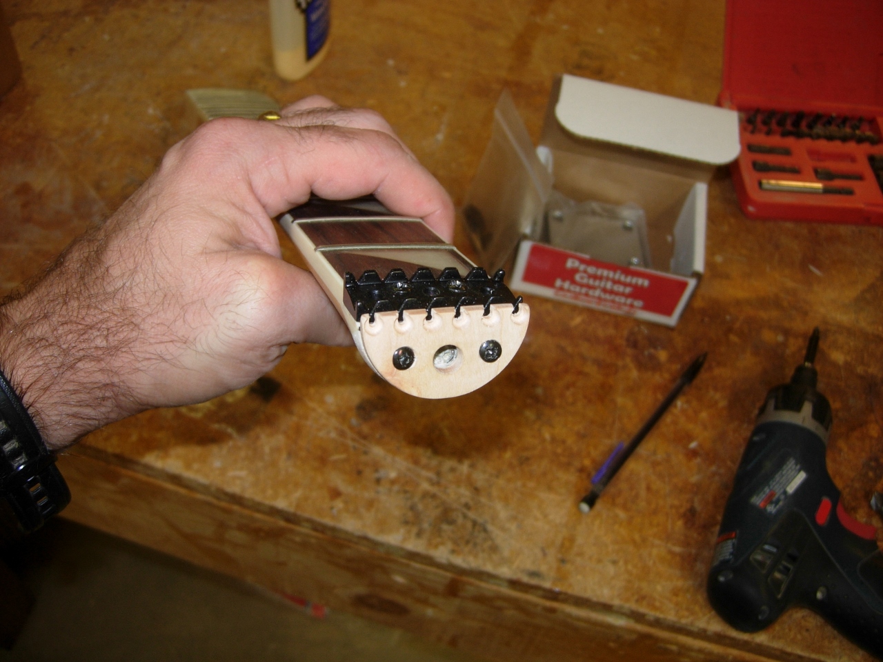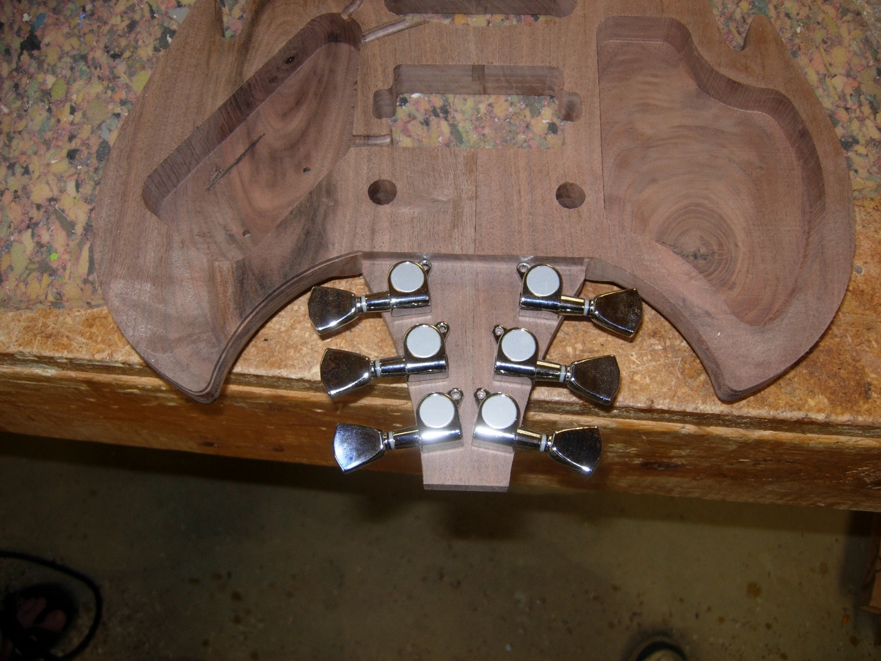 Since the bridge posts are press fit, I set them in only a little ways, to make sure they lined up with the bridge. They will get pressed in later, after the finish is applied. I also installed the machine head tuners to check them as well. It is a tight fit, but it will work.