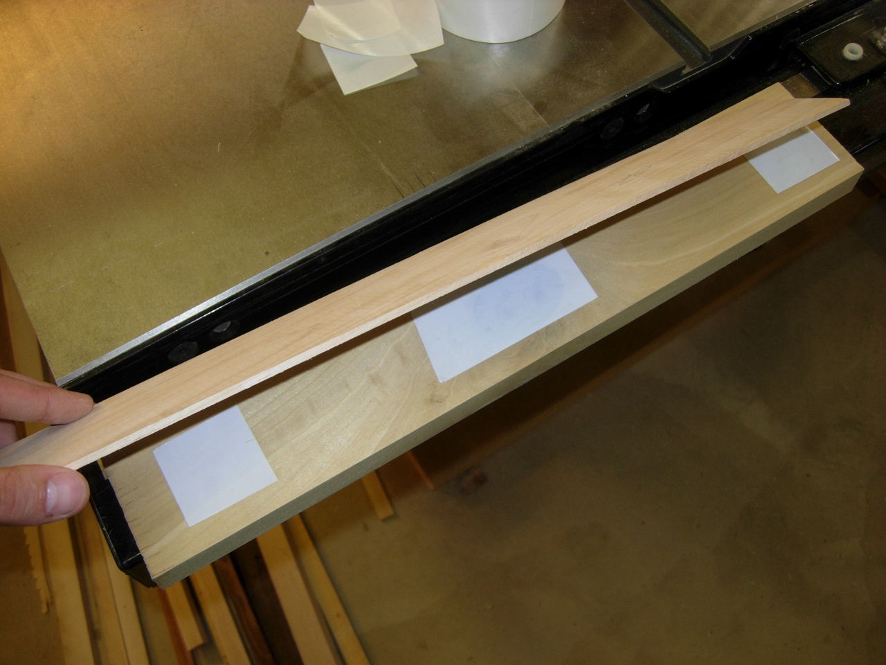 I have an old guitar neck that someone gave me, and I intend to convert it to my purposes. After I chop off the head, I need a plate that can hold the strings. I designed something, on the CNC, that I want to try. It will be thin, so I taped a 1/8″ thick piece of maple to a thicker piece of poplar. Now I can cut all the way through the maple without worrying about the piece breaking free.