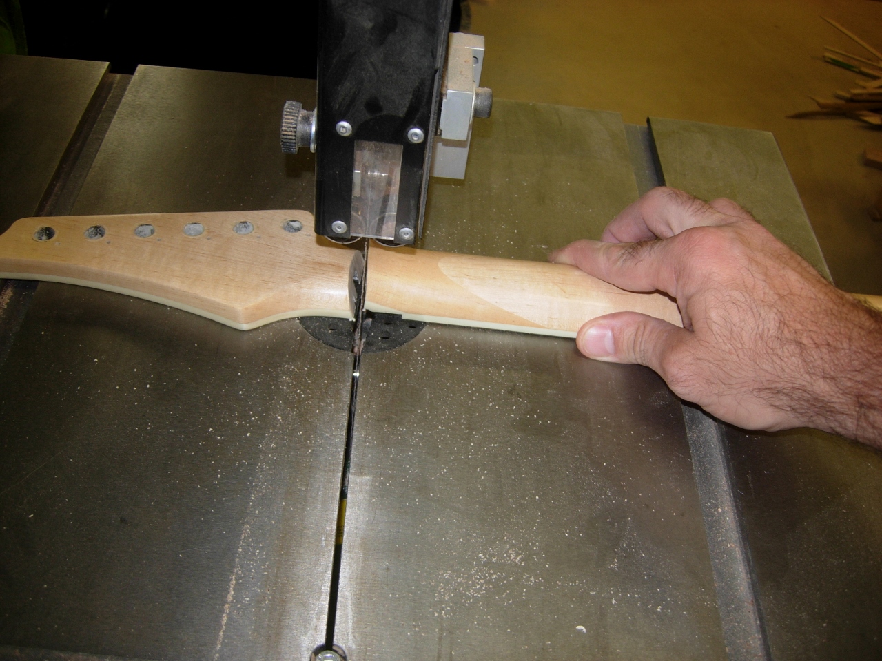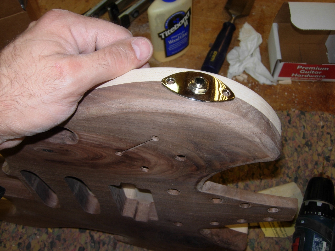 It was set up for a Floyd Rose style nut, so I cut the head off just past it, and attached the headplate. I even left a hole for adjusting the truss rod. This will not be the final version of the headplate, but I needed to test the concept. When I find one I like, I will have it made in steel or brass.