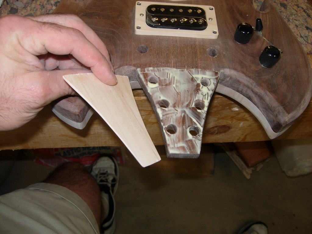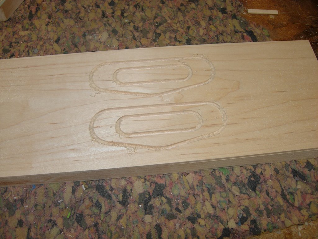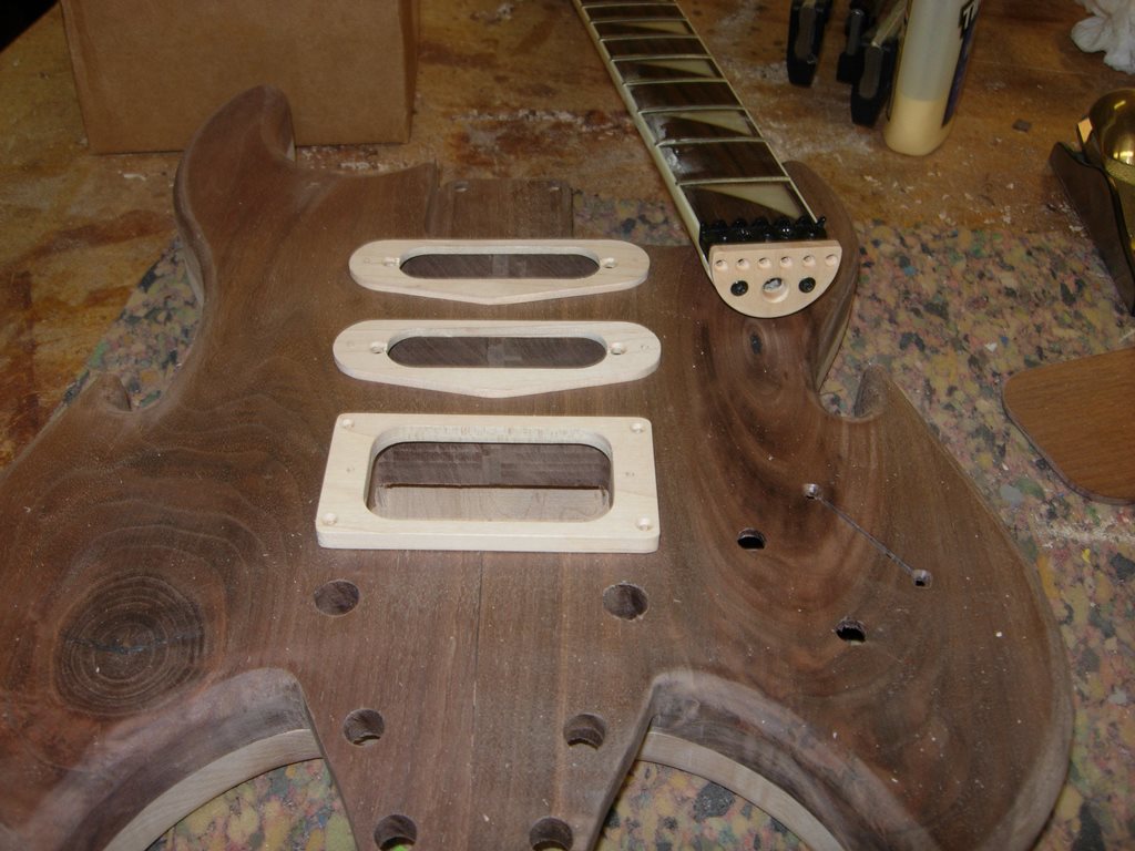 I also cut some coil trim pieces as well as a new design of the headplate. I like the drop-in design of the other headplate, but I think that will work better on a metal headplate. Since I am prototyping this in wood, I decided to thicken up the plate and make it harder for the strings to pull out by enclosing the string pockets.