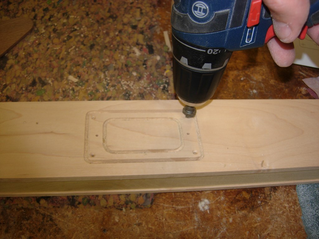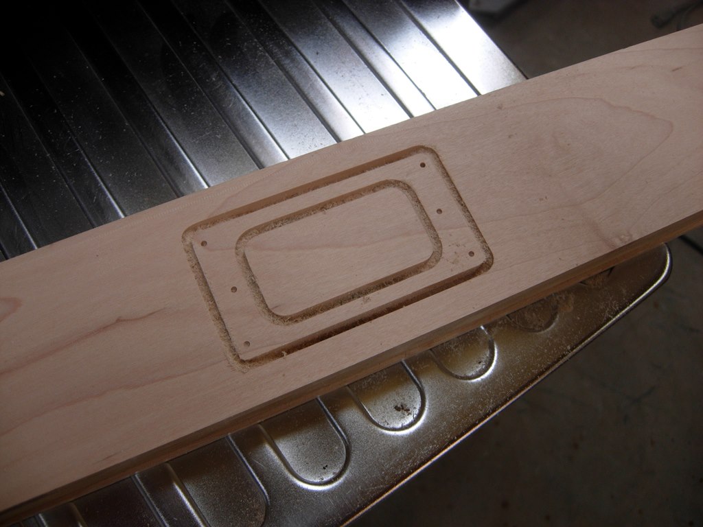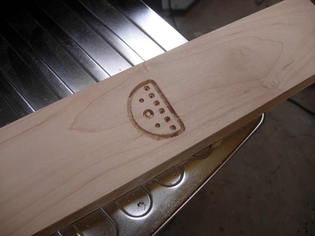 I also cut out a trim plate for the humbucker . While all of the trim pieces where still taped down, I drilled and counter-sunk all the holes. I couldn’t pre-drill everything on the CNC because I have a limited selection of bit diameters. Instead, I made small, 1/16″ dimples to show me where to drill.