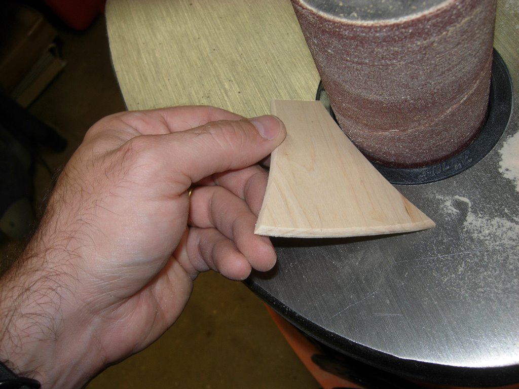 To rectify this problem, I decided to make a 1/8″ thick maple saddle to cover the tail. I traced the tail and added a curve to the top, then cut it out on the scroll saw and sanded a bevel on the edge.