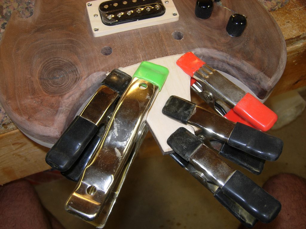 When the glue was dry, I flipped the guitar over and drilled out the new plate.