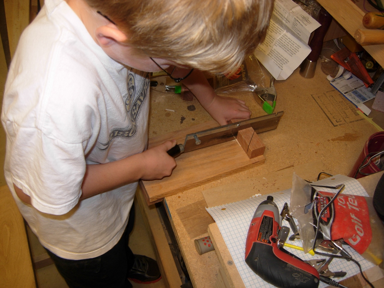 I tried to let Adam do as much of the work as possible, but I had to help a little. He started by assembling the rear and drilling locating holes. Next he cut the supplied dowel to make the locating pins.
