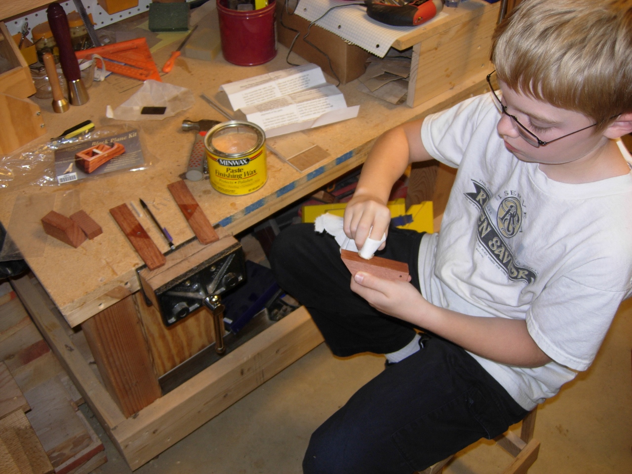 Adam applied the paste wax, with a paper towel, then the glue, with a brush.