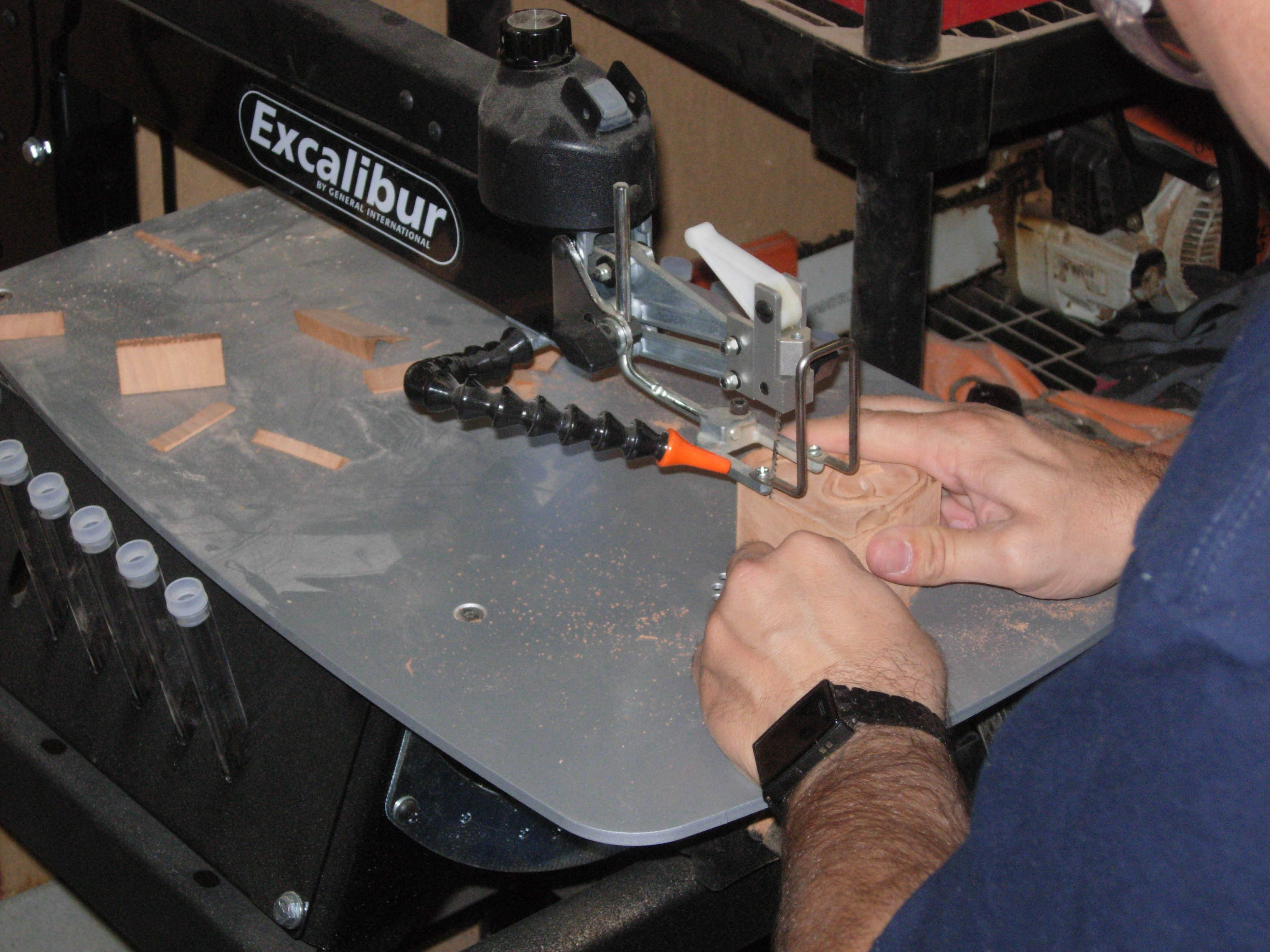 He shifted over to the scroll saw to clean up some areas that were too rough from the band saw.