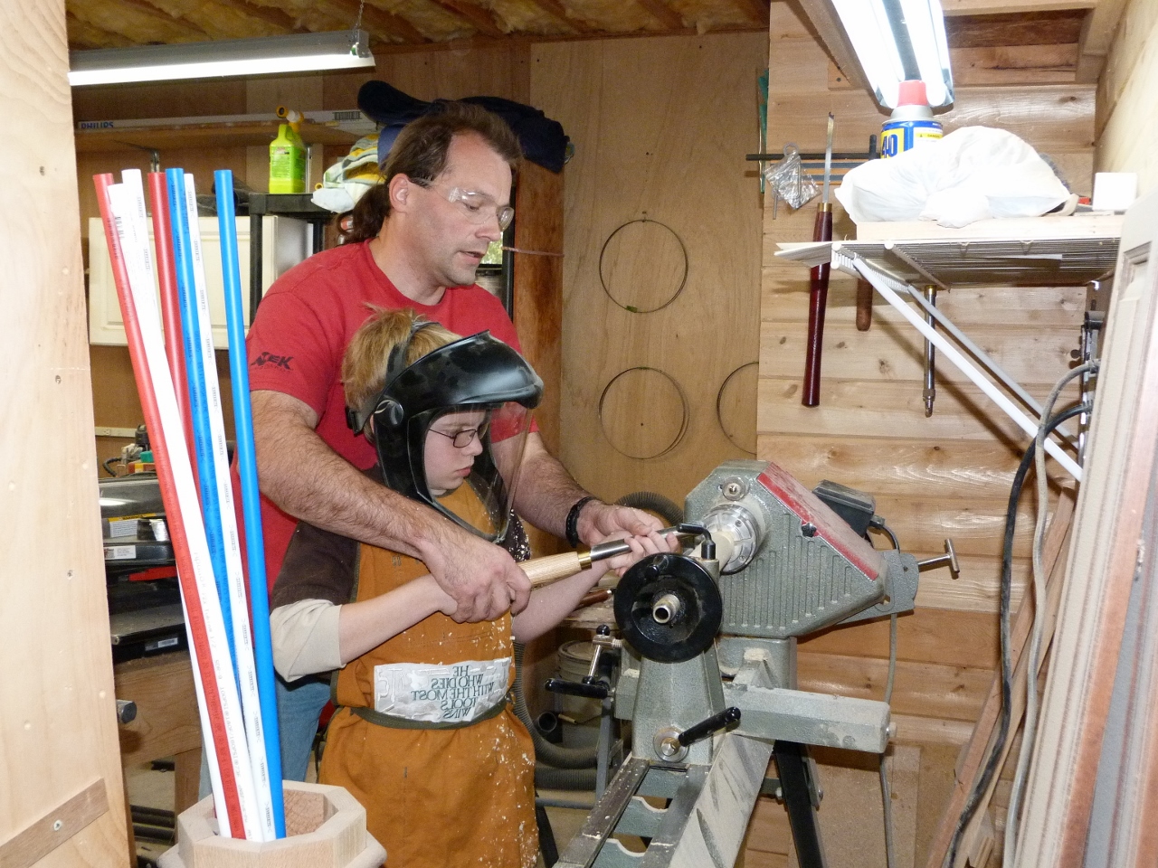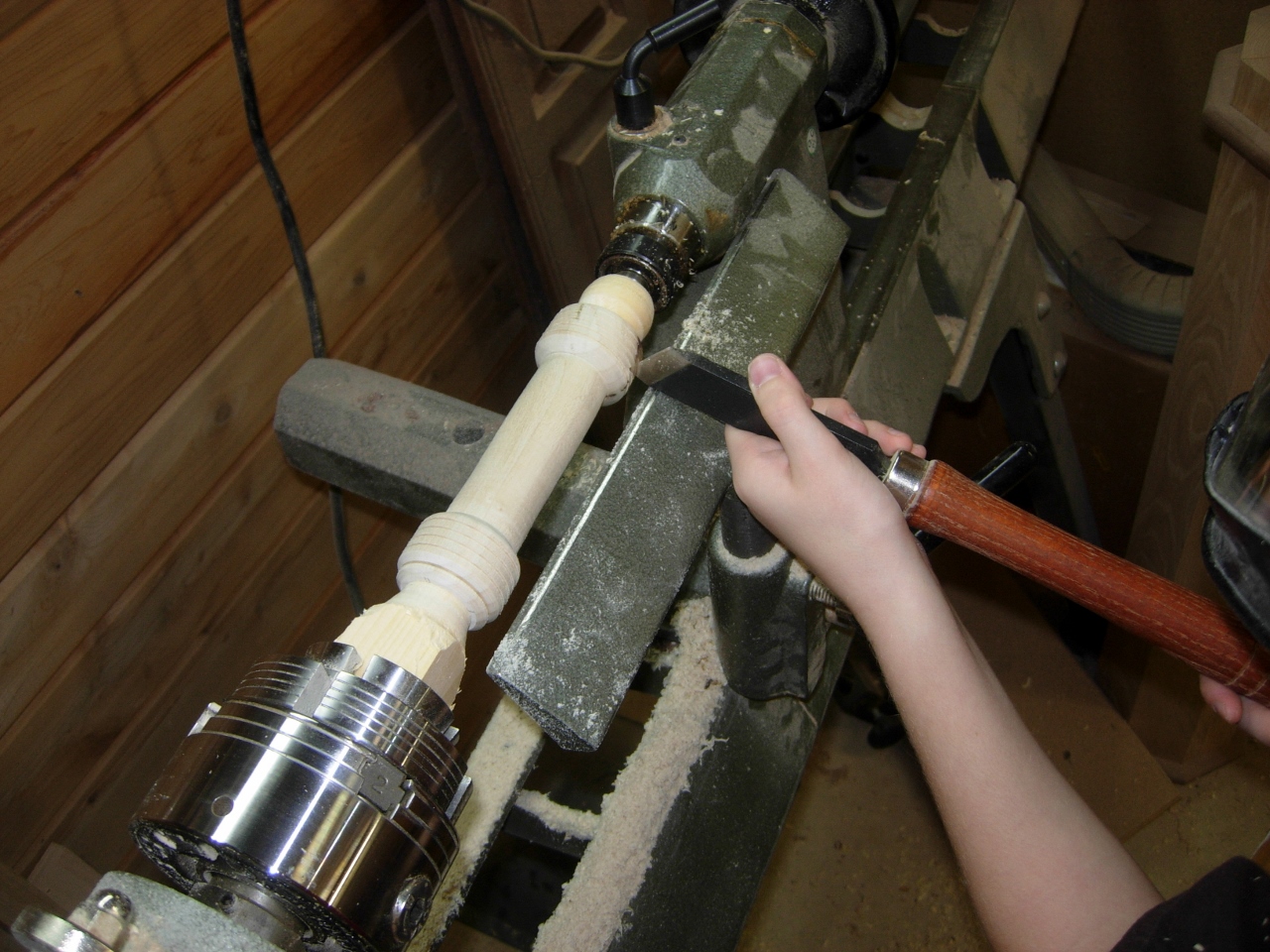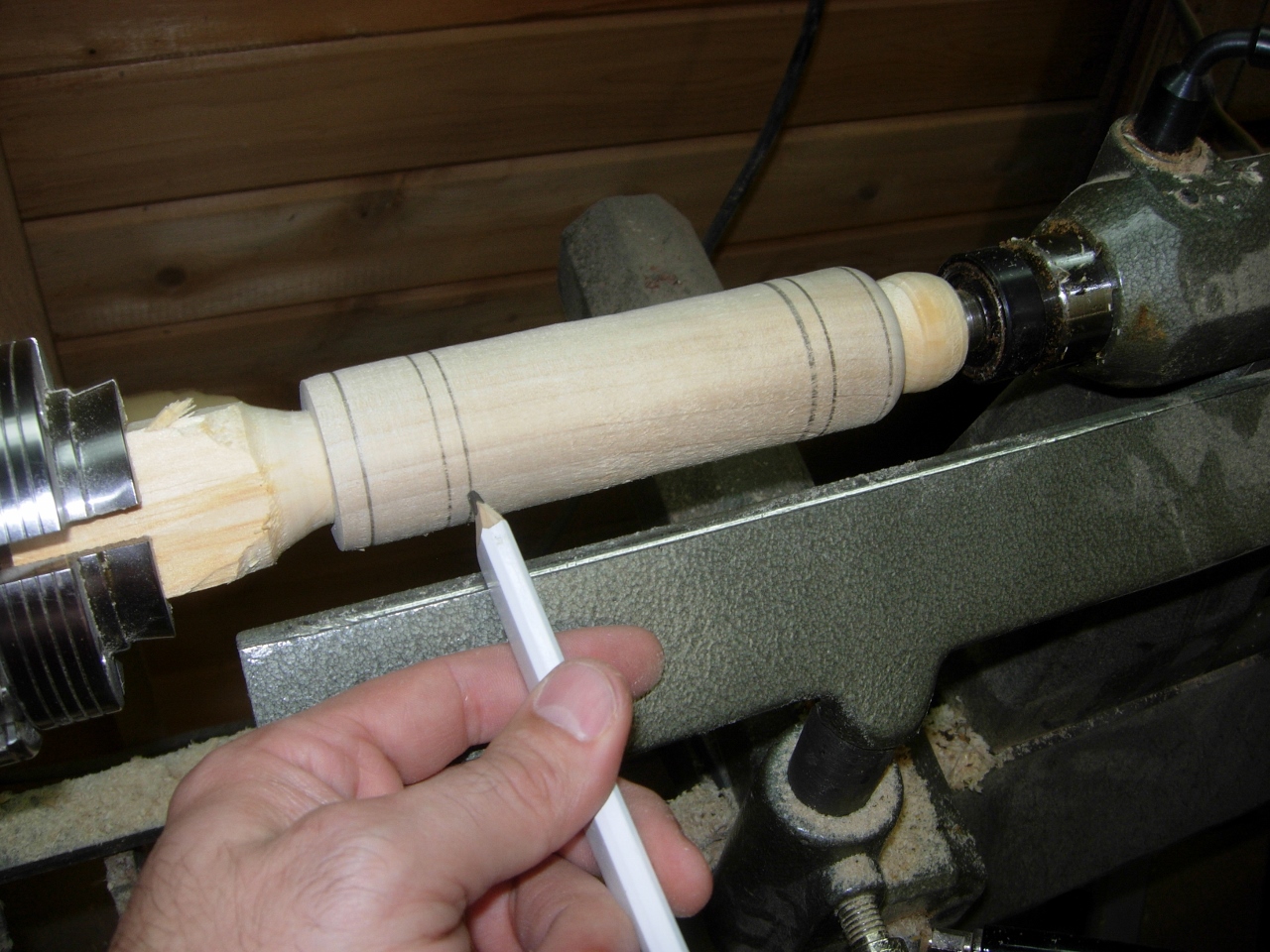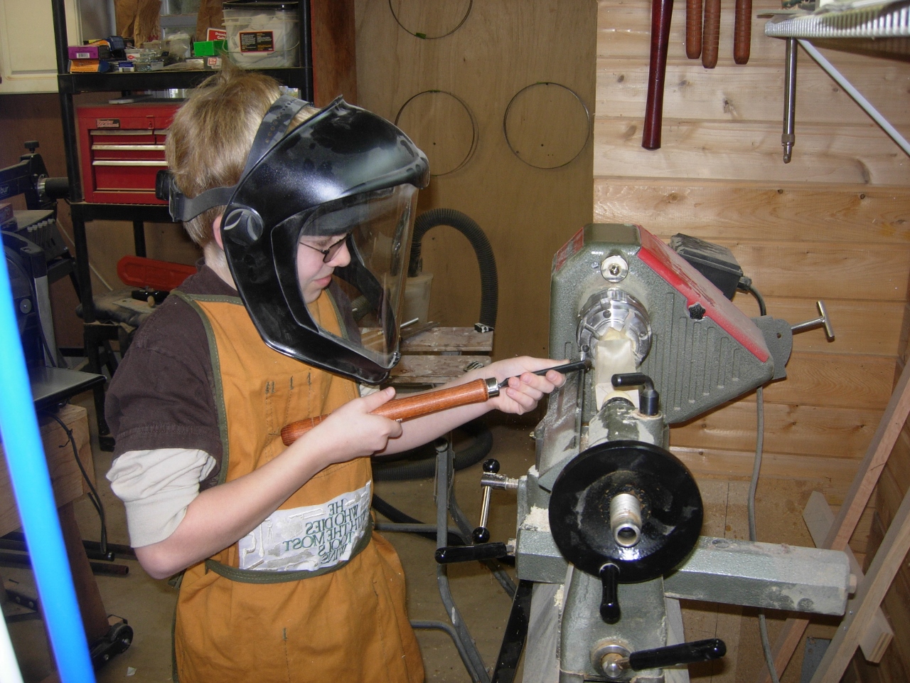 Adam wants to make some stuff for the Christmas in the Country Holiday Art and Craft Festival, at our church, next week. I figured he better start soon… Since the light saber project was quick and easy for him to make, we figured we could get a couple of dozen made in time. It is also great practice for Adam to learn to use the lathe on.