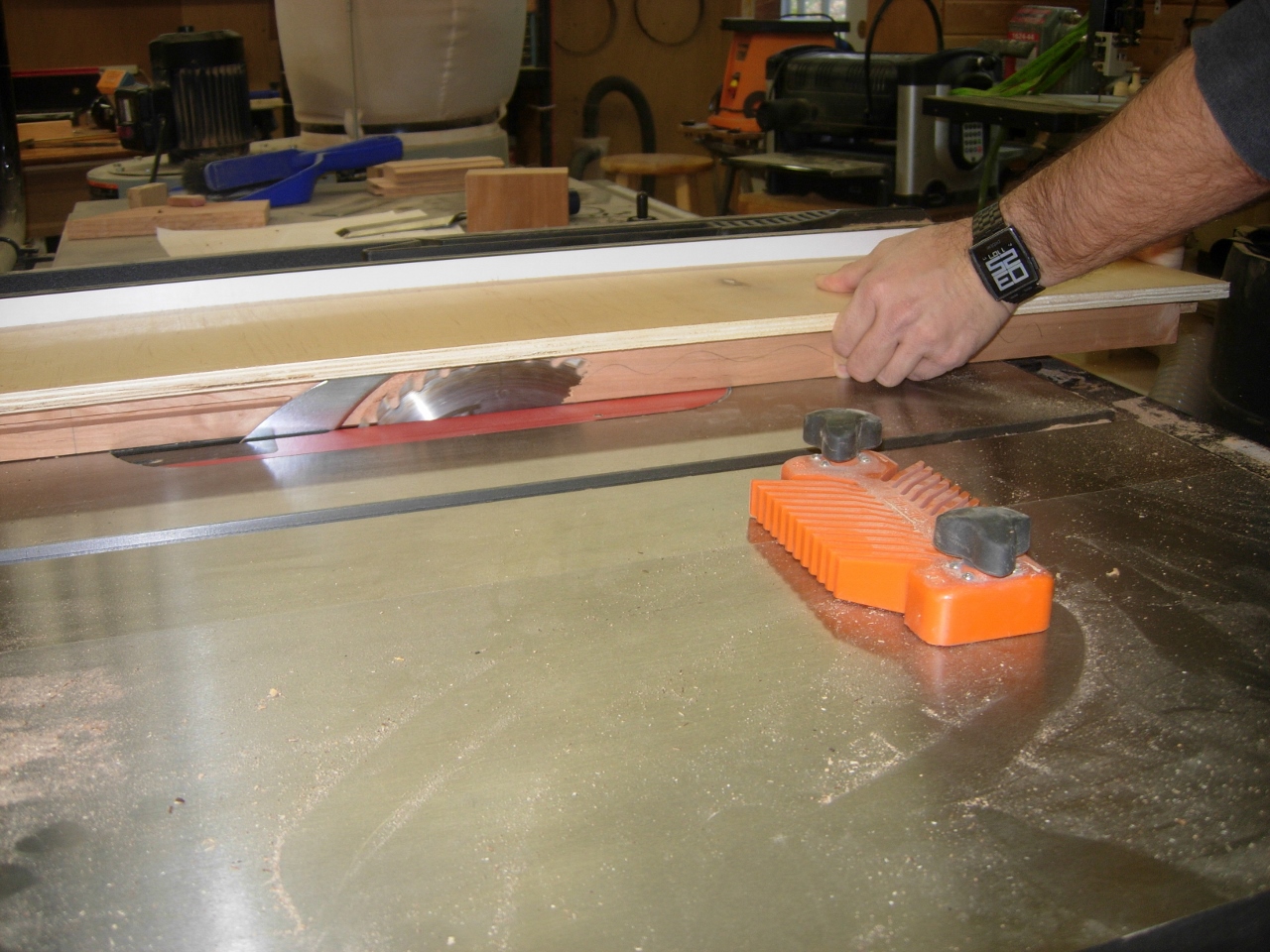 We made sure that the fence had not moved from where we had cut the original groove. I raised the blade 1-1/2″ higher to cut the leg. Flipping the assembly over, leg down, we ran the leg, in the jig, through the table saw.