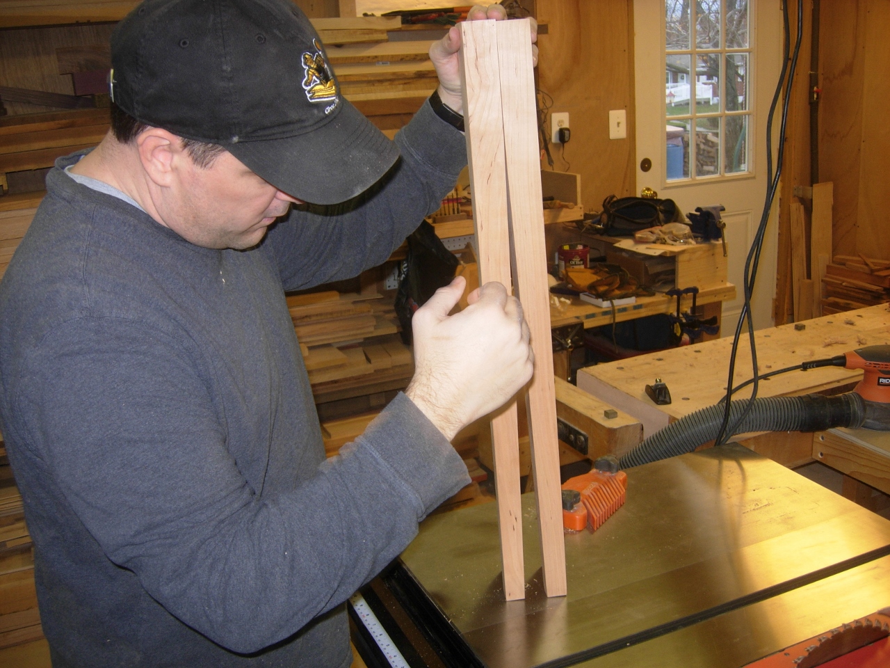 After doing this four times, we had a full set of tapered legs. Since cherry is very prone to burning, we needed to clean up the legs. Rob started with the orbital sander, but it was slow going on the hard cherry.