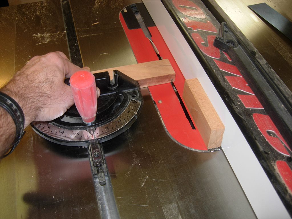 Since combining the miter gauge and the table saw fence, in the same operation, can cause binding and possible a safety hazard, I attached a spacer block to the fence with double-sided tape. This allows Rob to locate the blank of wood, that he needs to notch, then push the wood through the blade, without binding.