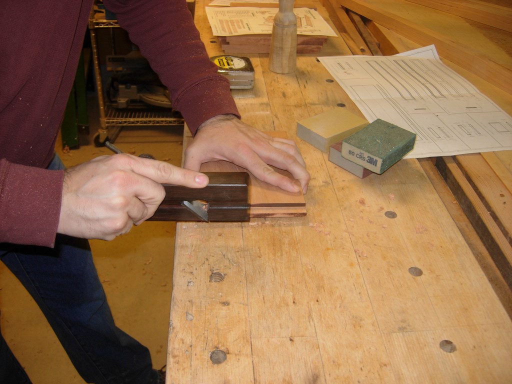To clean up the tenons and take them down a few thousandths, to perfectly fit into the legs, Rob ran my bull-nose plane along each side, a few times.
