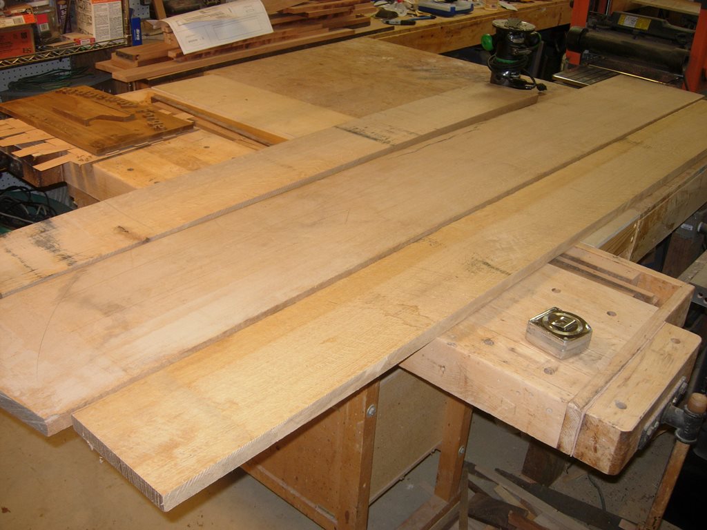 I acquired some air-dried, 5/4 thick, quarter-sawn white oak for the purpose. The boards were roughly 8′ long, so I cut them all in half to make them manageable.
