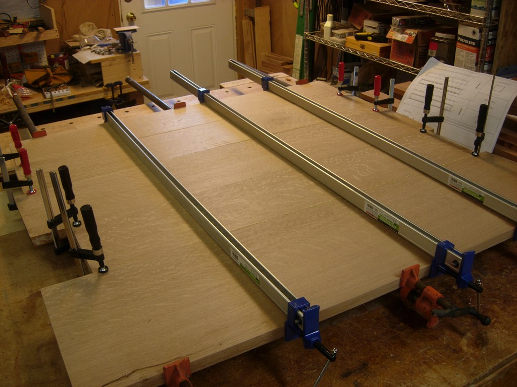 I recently acquired three large pipe clamps. They will be perfect for glueing up all the panels. To avoid the slightly rusty metal from coming into contact with the wood, I applied a piece of painter’s tape to each of the rails. White oak and steel do not react well together. The oak tends to blacken with prolonged contact. The tape prevents that while protecting the rails from glue squeeze-out.