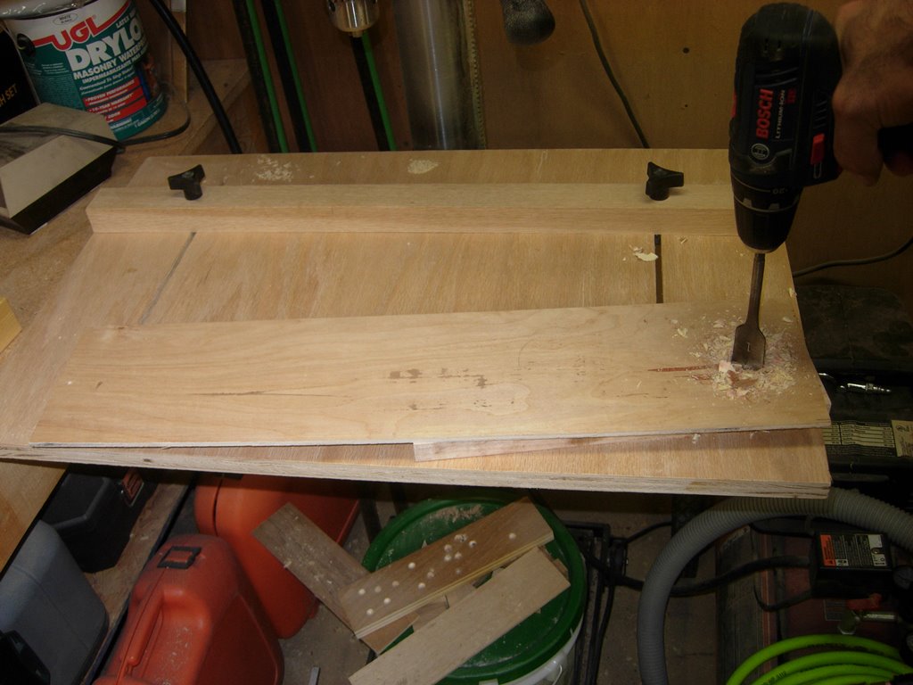 My friend Bryan at K&A Design uses a circle cutting jig, that he made. His is adjustable so he can mount it to his router then pick one of several different center points for pinning, then swing the router in a perfect circle like a compass. I decided to use a modified version of that jig. I grabbed a scrap piece of luan, 1/4″ plywood, and drilled a 1″ diameter hole in one end, and a 1/8″ diameter hole at the other. Since I want a 43″ diameter circle, I marked 41-1/2″ from the 1/8″ hole to locate the inside edge of my cutting bit.