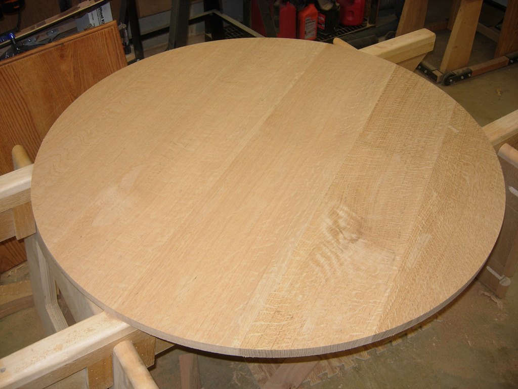 I started another new project this week. A friend of mine has a wrought iron table base that needs a top. The request was for a dark stained oak, 43″ in diameter.