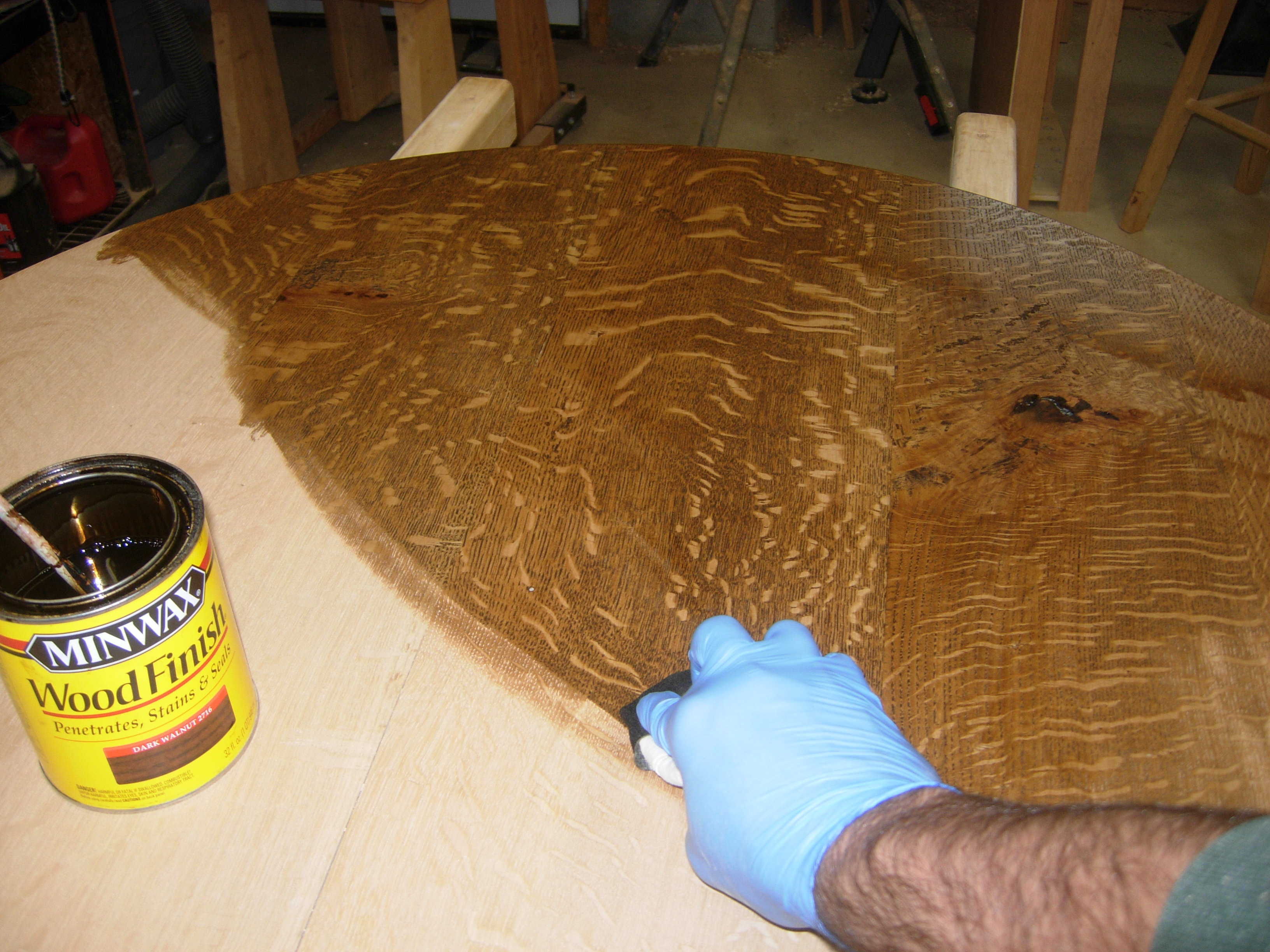 I finished staining the top and left it to cure. The quarter-sawn oak always has that beautiful tiger striping. The stain really accentuates it.