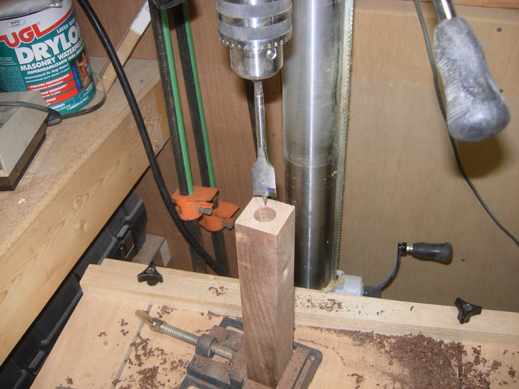 I marked the centers of the ends and drilled a 7/8″ hole in the blade end with a forstner bit.