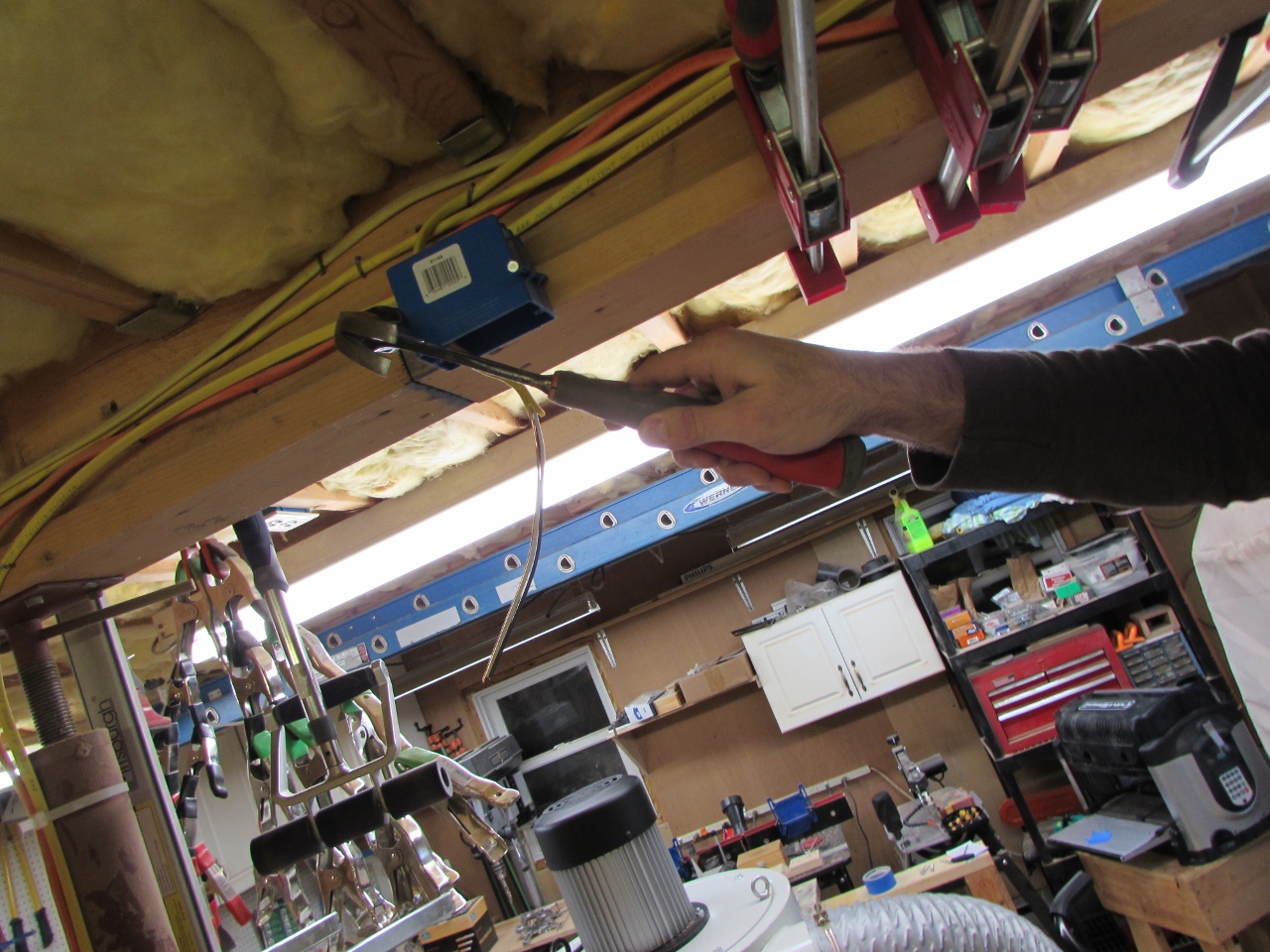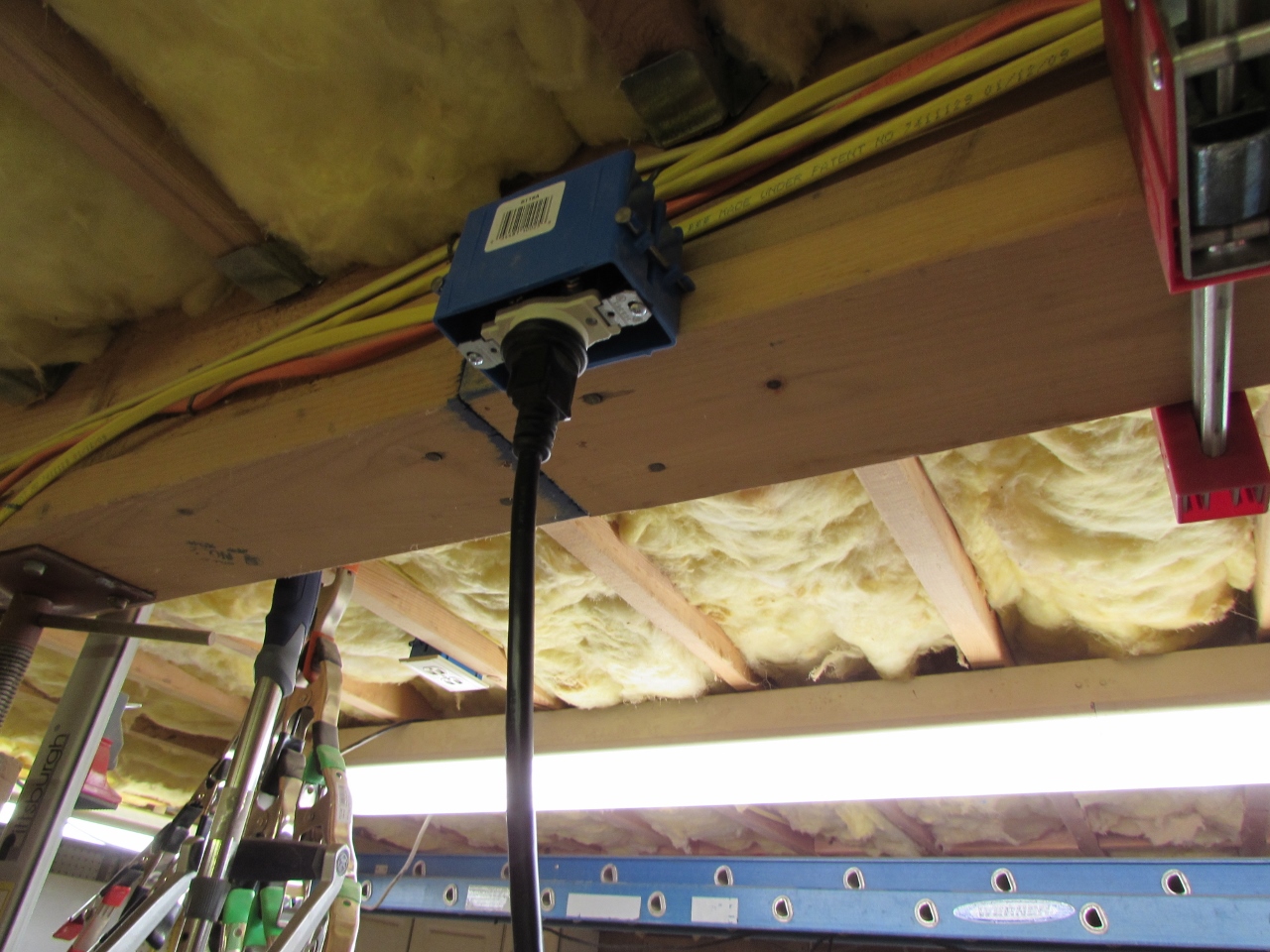 I stapled the wires to the wall where all of my other shop wiring is run. I know the exposed wiring is not entirely attractive, but it is in the garage. I installed a box above the dust collector and hooked up the receptacle.