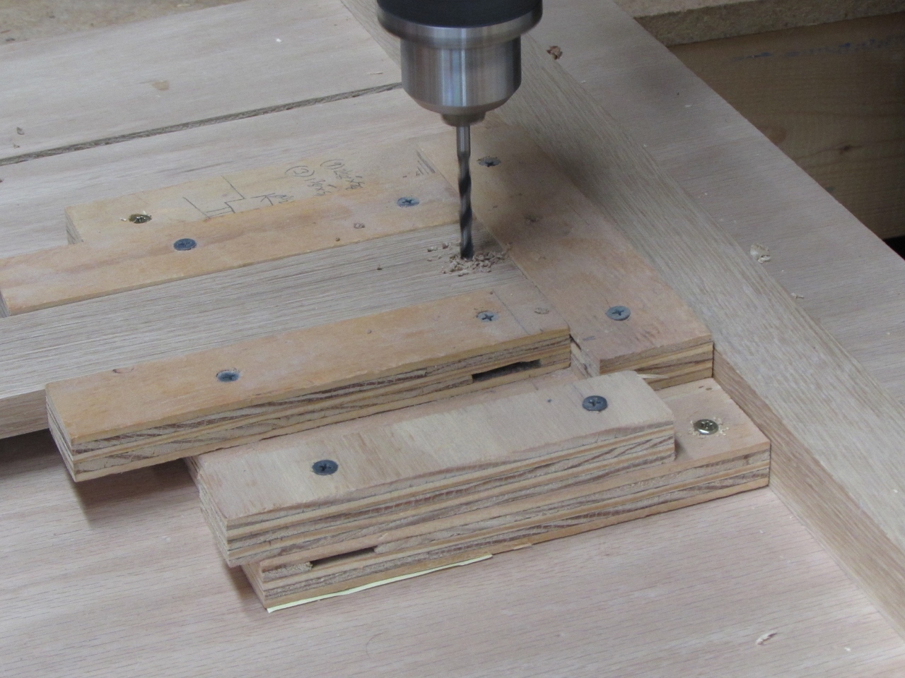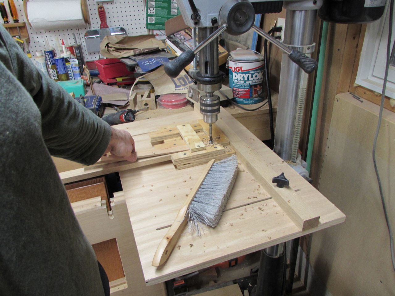 I put a stop to that by simply screwing a cross-brace across the slots. By adding a shim, after the board was inserted, it was effectively clamped in place and I could drill away without even holding the slat down with my hand. With that problem solved, I finished all the holes on the wider slats, then drilled a 1/2″ diameter, 3/16″ deep counter-bore to create a recess for the screw head.