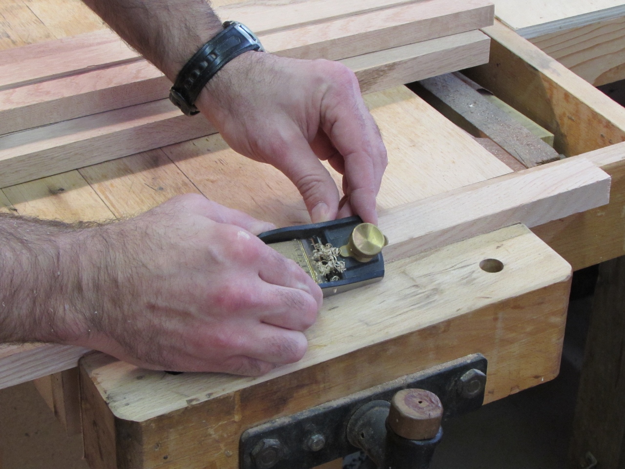Once they were cut down, I selected the smoothest side and planed a small chamfer on either side. I did this because this side will face the floor. Since most of the pieces were planed, the corners are very sharp. I didn’t want anything on the bottom that could snag the carpet it would be sitting on. Since the bases will be very heavy, I just assumed they would be slid around instead of carried.
