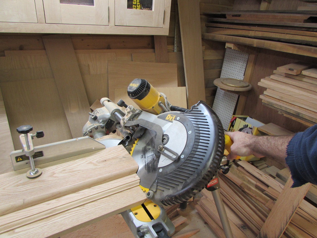 Before I miter the base trim assemblies, I used my digital gauge to make sure the blade is set at exactly 45 degrees. Next, I place a 1-1/4″ spacer up against the fence, and clamp down the base assembly. I cut a 45 degree miter along one side, then grab another piece and miter the opposite side.