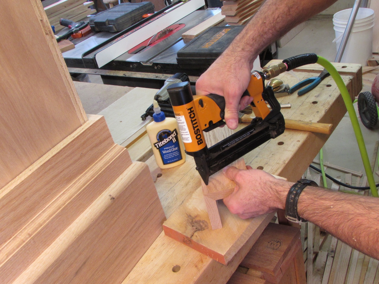 Making sure they line up flush with the top, I glue and pin them in place as well.