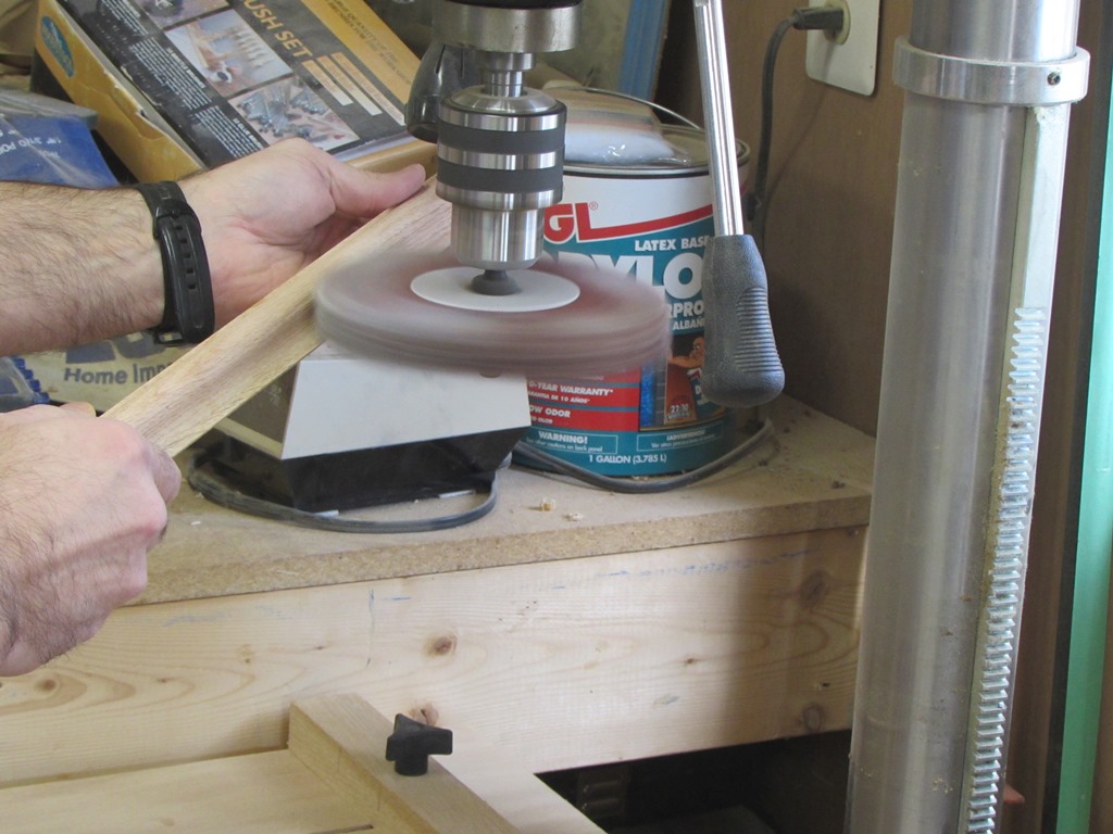I cut all of my trim down to about 1″ oversized, and put a miter on one side. This makes the pieces more manageable with the mop sander than keeping them 4′-8′ long. It also makes it easier to mark and cut each piece as I install them. The mop sander is basically a stack of sand paper, bolted together, that has the edges cut into 1/4″ wide strips. Then you spin it very fast, it spreads over the surface of whatever you press into it, and gently sands away the rough edges. I have discovered that the mops last a lot longer when you spin them at a higher velocity. This one is running at about 1500 rpms, and it does a nice job of smoothing out any chatter marks from the router bit.