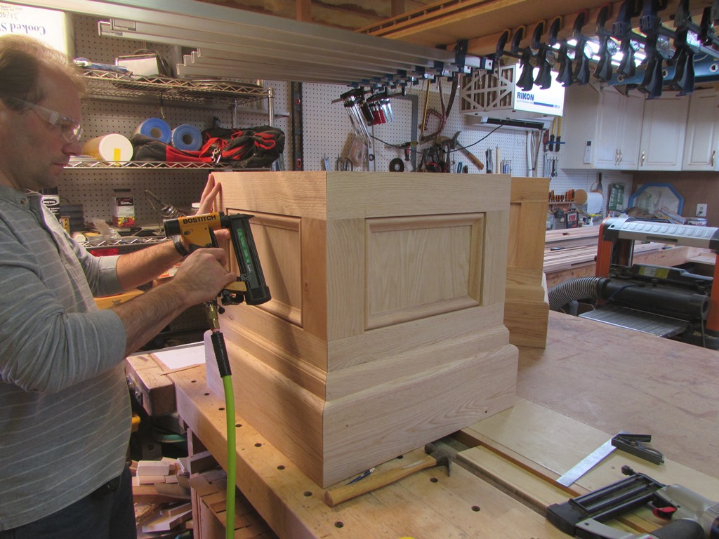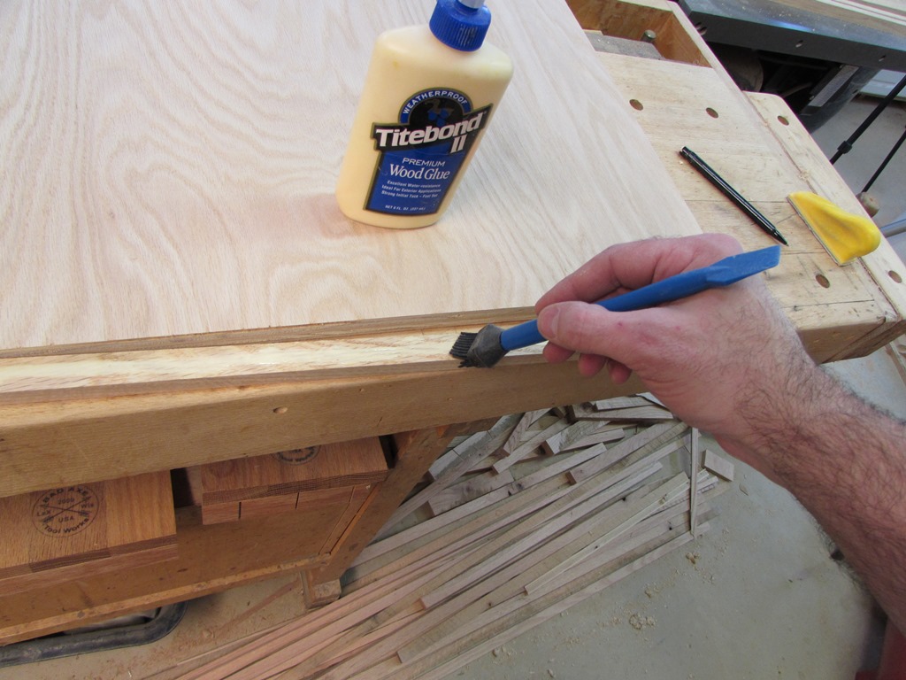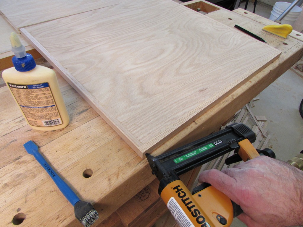 Final step is to spread wood glue liberally across the tops and shoot a couple of brad nails in to hold the tops in place while the glue dries.