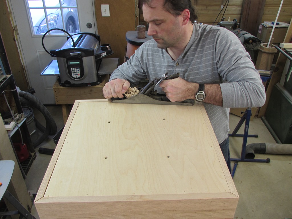 Before adding tops to these boxes, I want to make sure that the tops are completely flat. The trim on two sides is about 1/16″ too tall, so I used my jack plane to bring the edges down flush. I plan on glueing the tops and they need to be dead flat for there to be a good glue bond.