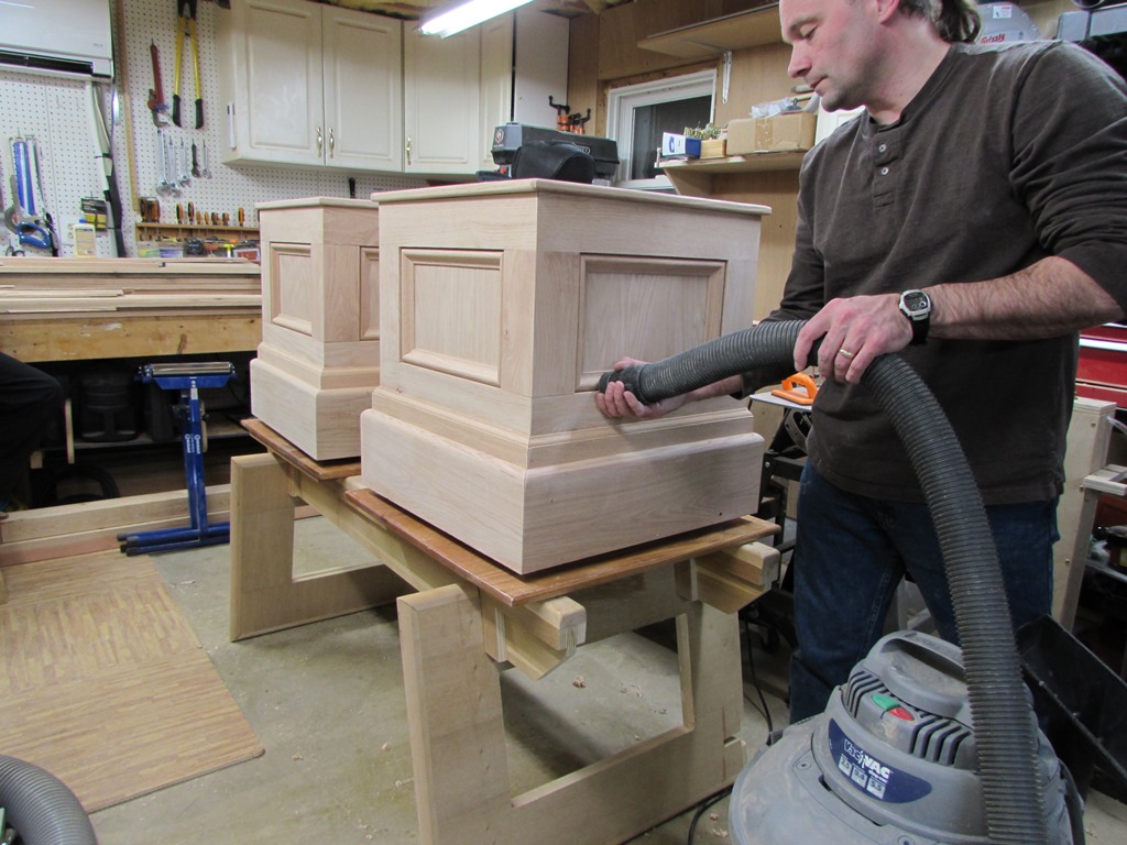 I had a few minutes last night to get the stain on my statue bases. I noticed that a lot of dust had settled over night, so I ran the shop-vac over the surface to suck off any dust without stirring it up.
