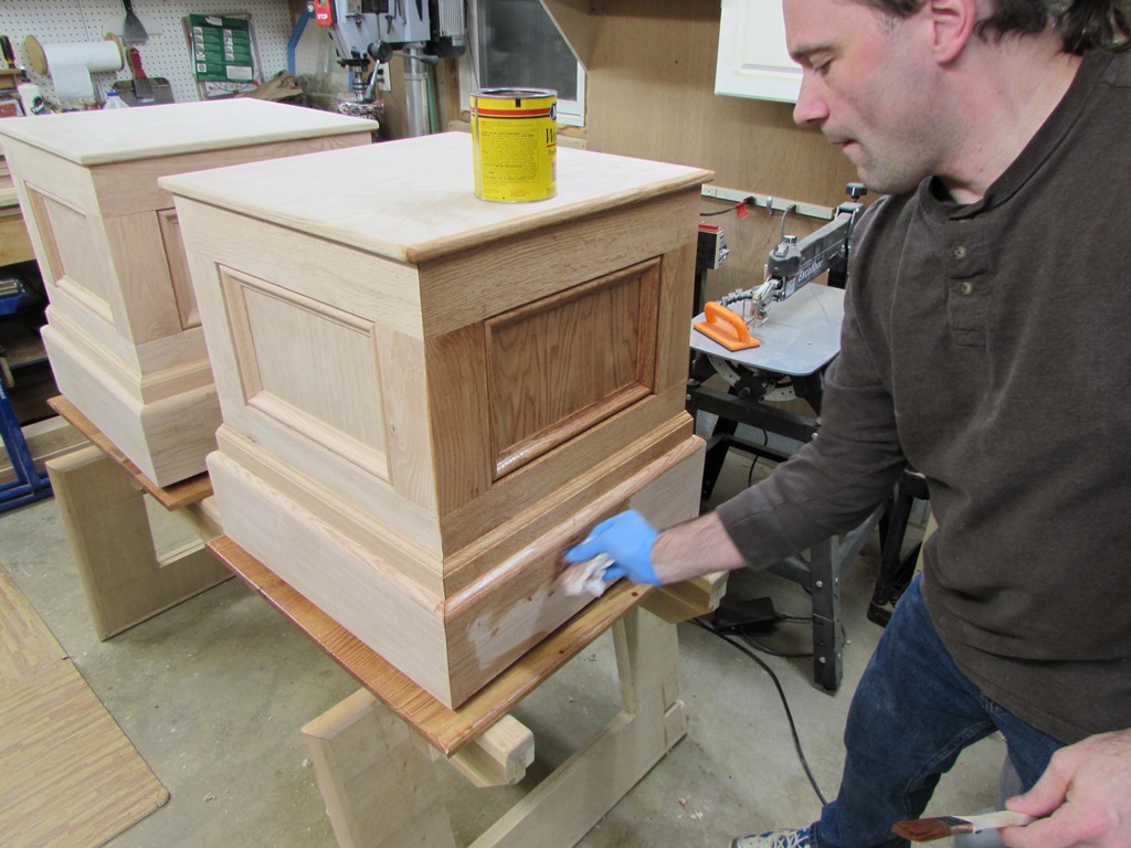 Both boxes are now stained. I will let them sit for a day to cure, then set up a temporary spray booth for the polyurethane.
