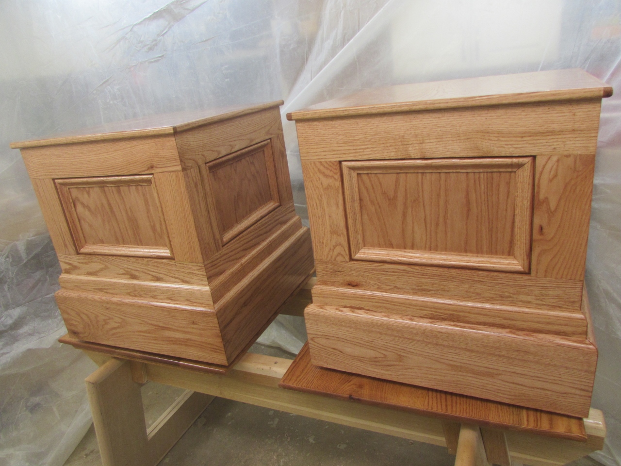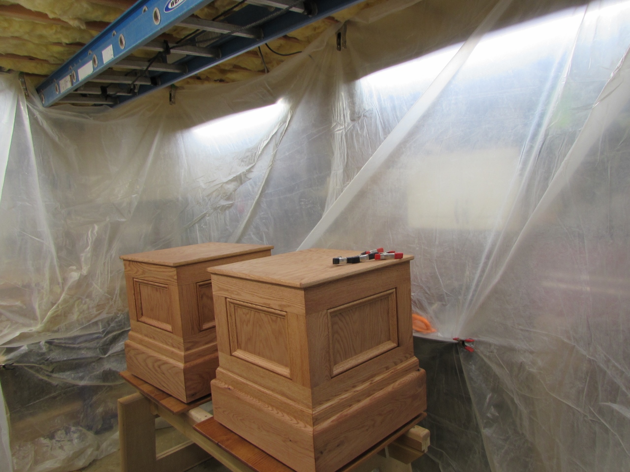 The stain has set for two days, and I had a few minutes, this evening, to get the first coat of polyurethane on. If I was brushing on the poly, I would need an hour or two, but I will be spraying. The boxes have a lot of nooks and crannies, and the sprayer works well on those.