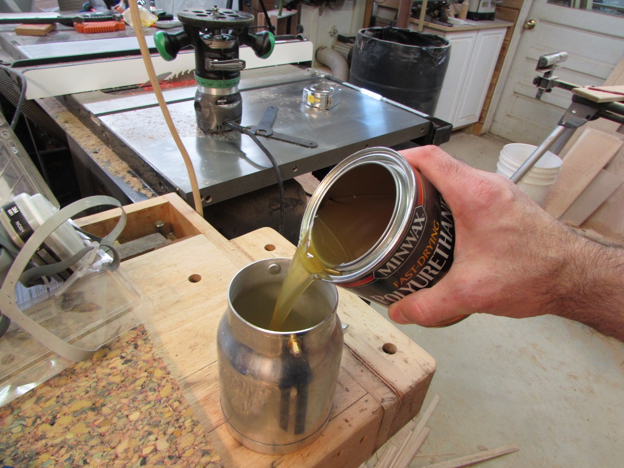 I have checked the consistency of Minwax polyurethane before and found it thin enough to go through the sprayer without having to add anything else, so I just pour a pint in and set it all up.