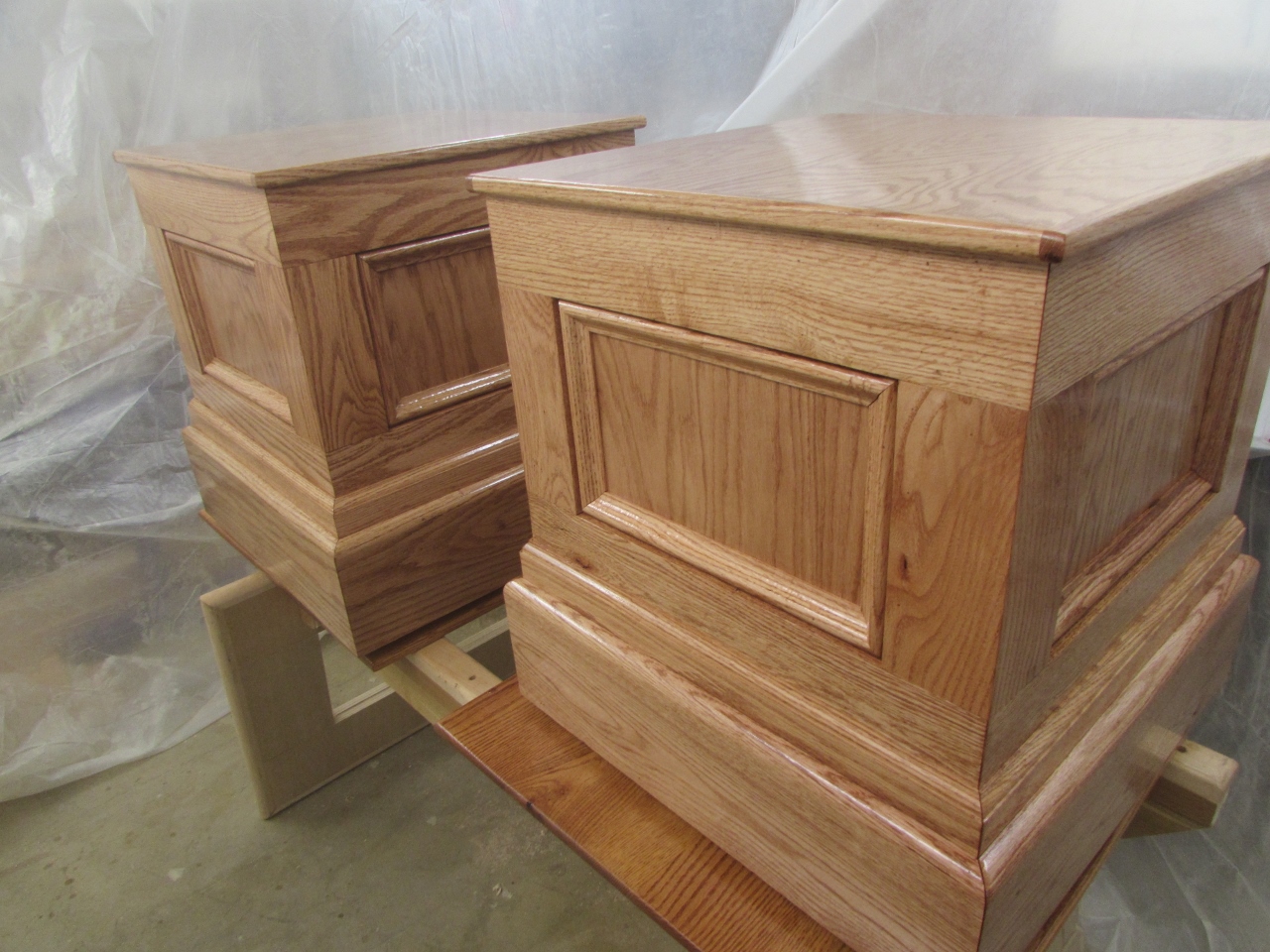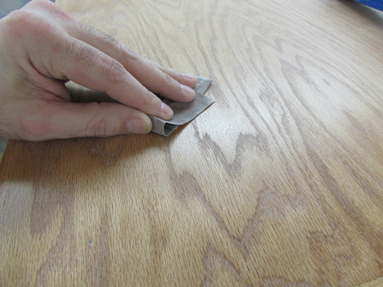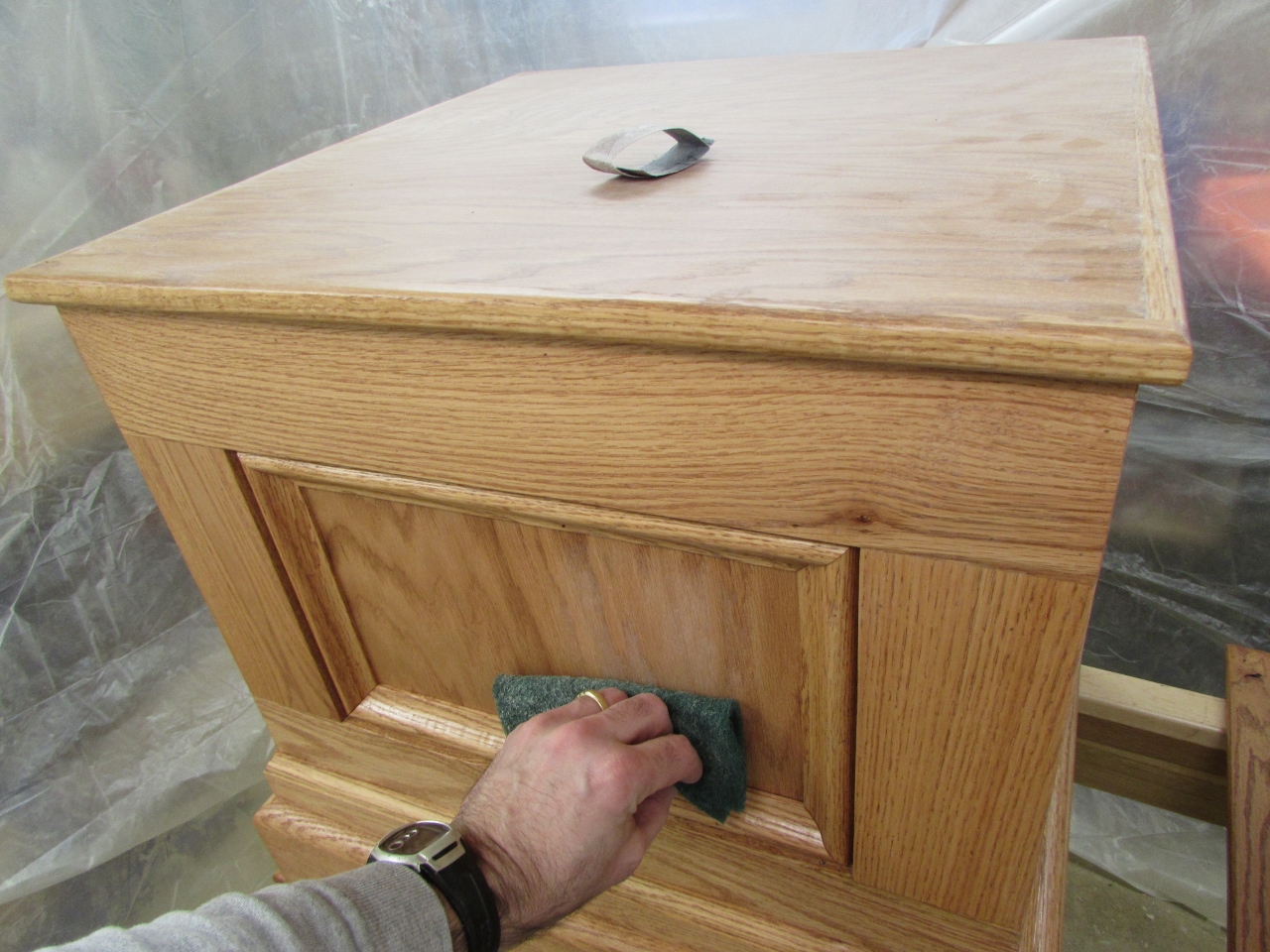 Before I apply the second coat of poly, I need to sand down the finish to remove any raised grain or dust nibs that settled on the boxes while they dried. I usually prefer to use a fine steel wool, because it forms around the moldings nicely, and it is not too aggressive. One problem, All my steel wool and sand paper is in that cabinet in the far corner, behind the newly erected spray booth. Since I don’t really feel like crawling under my bench or climbing over it, I decided to look for alternatives…